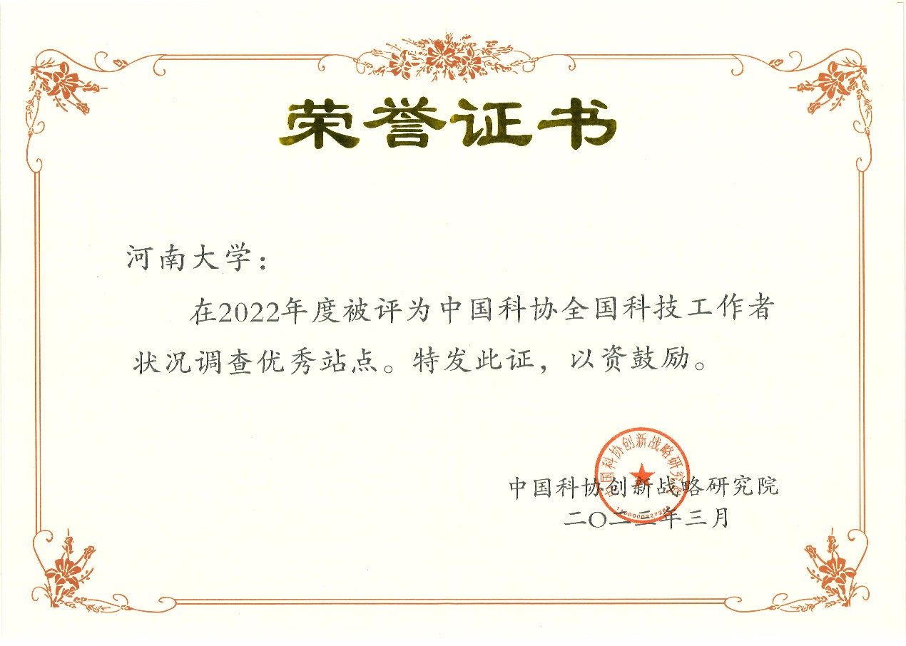 近日,中国科协创新战略研究院公布了《关于2022年度全国科技工作者状况调查优秀调查站点和优秀区域责任部门的通报》,永利官网被评为全国科技工作者状况调查优秀站点,刘敏同志被评为优秀调查员。此次,全国有80个站点被授予“优秀调查站点”称号,河南省有7个全国优秀调查站点。