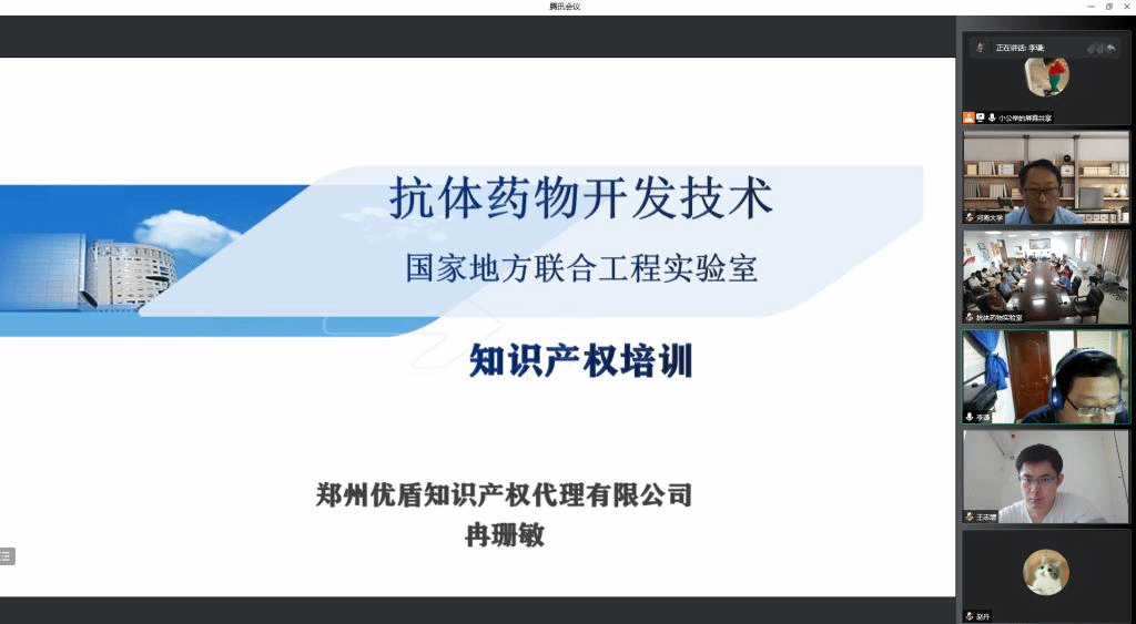 为深入贯彻落实国家知识产权局、教育部和科技部等部门有关文件精神,有效防范非正常专利申请,全面提升永利官网专利申请质量,强化高价值专利的创造、保护、管理和运用,突出转化导向,促进科技成果转移转化,611日上午9点钟,科研院邀请郑州优盾知识产权代理有限公司的冉珊敏专利代理师对抗体药物开发技术国家地方联合工程实验的师生们进行了知识产权专题培训。科研院李谦副院长参加并主持培训会。周六,虽然是休息日,但对抗体药物开发技术国家地方联合工程实验的师生们来说,是正常工作日的一天,这已经成为了师生们的惯例和自觉行为。