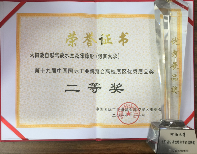 经申报、推荐、评选等程序,永利官网化学化工学院王新海博士报送的“太阳能自动驾驶水生态保障船”获高校展区优秀展品奖(二等奖),科研处杨浩获高校展区先进个人。