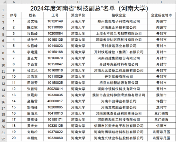 为深入实施创新驱动、科教兴省、人才强省战略,充分发挥科技创新支撑引领和人才第一资源作用,根据《河南省“科技副总”三年行动计划(2024-2026年)》(豫科〔2024〕75号)有关安排部署,经需求征集、岗位发布、企业申报、地市推荐、专家审核、名单公示等程序,12月23日,省委组织部和省科技厅联合发布了《关于公布2024年度河南省“科技副总”名单的通知》,在学校党委组织部和yl7703永利官网共同宣贯和组织下,永利官网申报的20位“科技副总”经省委组织部和省科技厅组织专家进行评估遴选,全部入选。