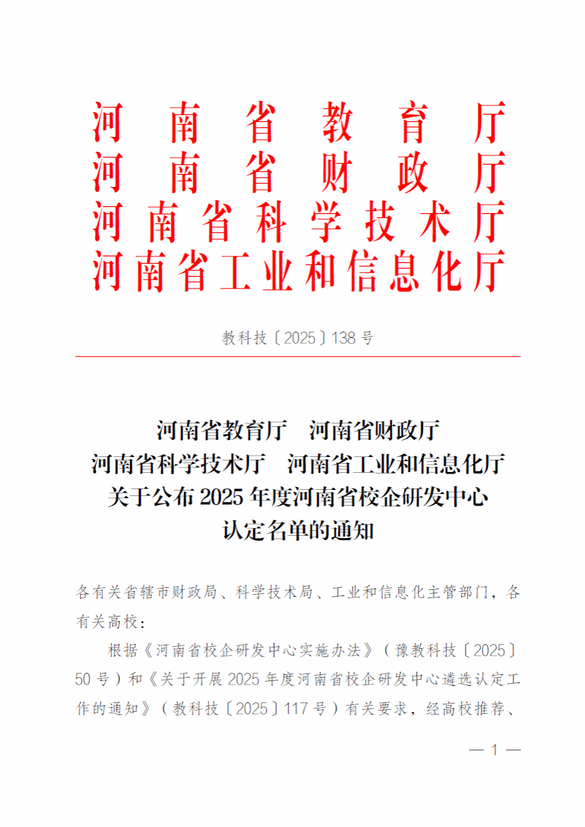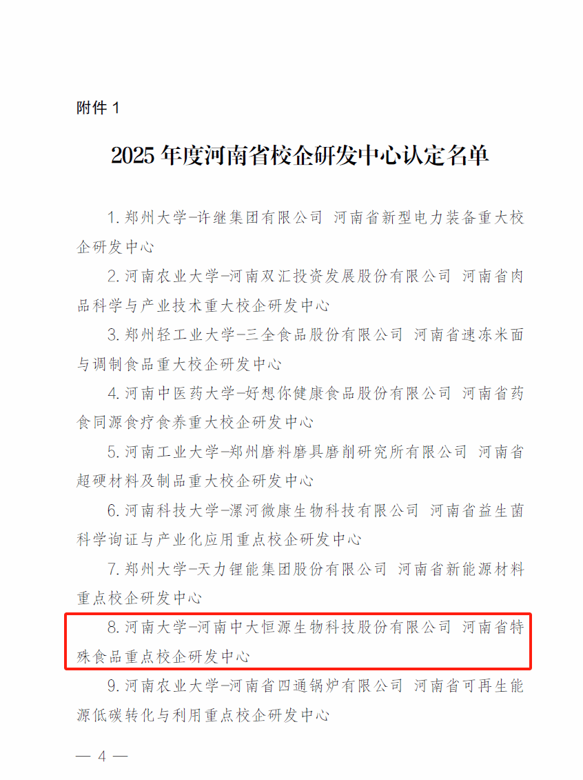 近日,河南省教育厅、财政厅、科学技术厅、工业和信息化厅联合公布了2025年度河南省校企研发中心认定名单,永利官网农学院康文艺教授团队与河南中大恒源生物科技股份有限公司联合共建的“特殊食品校企研发中心”获批河南省重点校企研发中心认定,获得省财政资金支持100万元。这是永利官网连续第二年获批河南省重点校企研发中心认定,标志着学校在校企协同创新、服务区域产业升级方面的能力稳步提升。