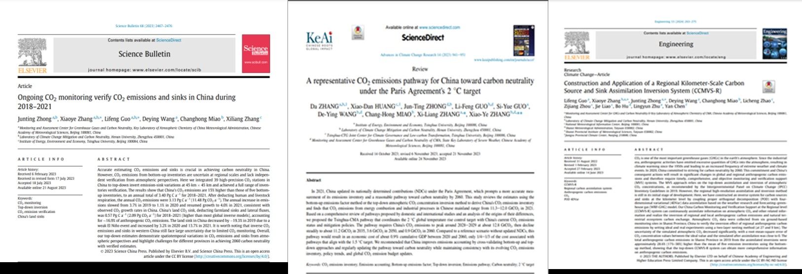 近两年,张小曳院士团队聚焦国际科技前沿,围绕国家碳中和战略,服务国家应对气候变化谈判,发表了系列研究成果。2023年10月,该团队以“Ongoing CO2 monitoring verify CO2 emissions and sinks in China during 2018–2021”为题在《Science Bulletin》上发表了相关研究成果,文章准确估算了我国2018-2021年人为碳排放和自然碳交换,通过反演获得我国45km×45km格点尺度的人为碳排放量和自然碳交换量,对我国实现碳中和目标提供重要数据支撑。2023年11月,以“A representative CO2 emissions pathway for China toward carbon neutrality under the Paris Agreement's 2 °C target”为题在《Advances in Climate Change Research》上发表文章,提出了一条中国实现碳中和目标的代表性碳排放路径,这一路径综合考虑了满足全球2°C温控目标,并衔接了中国碳排放现状与减排政策,为我国“双碳”战略规划进行碳排放现状摸底,同时对典型碳中和转型路径识别的决策提供支撑。2024年2月,以“Construction and Application of a RegionalKilometer-Scale Carbon Source and SinkAssimilation Inversion System(CCMVS-R)”为题在《Engineering》期刊上发表文章,构建了一个在公里尺度上进行碳源汇反演的系统--中国区域碳源汇监测核校支持系统(CCMVS-R)。CCMVS-R可以持续同化大气CO2和其他相关信息,并实现区域和局地人为碳排放和自然陆地生态系统碳交换的反演;该系统支撑了我国在全球应对气候变化谈判和碳中和行动及潜力评估,向开展全球-区域-省域-格点四级嵌套的碳收支盘点和陆地生态系统碳汇实时动态管理迈出重要一步。