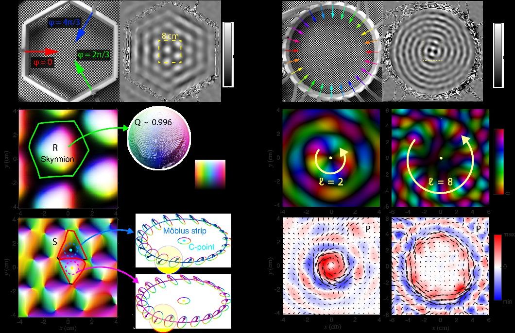 图 1 实验上生成和观测到的拓扑水波结构:(a)水波位移场Skyrmions, 自旋密度场Merons和偏振奇点与莫比乌斯环。(b)具有不同拓扑荷的贝塞尔型水波涡旋,自旋和轨道角动量垂直分量具有锁定关系。
