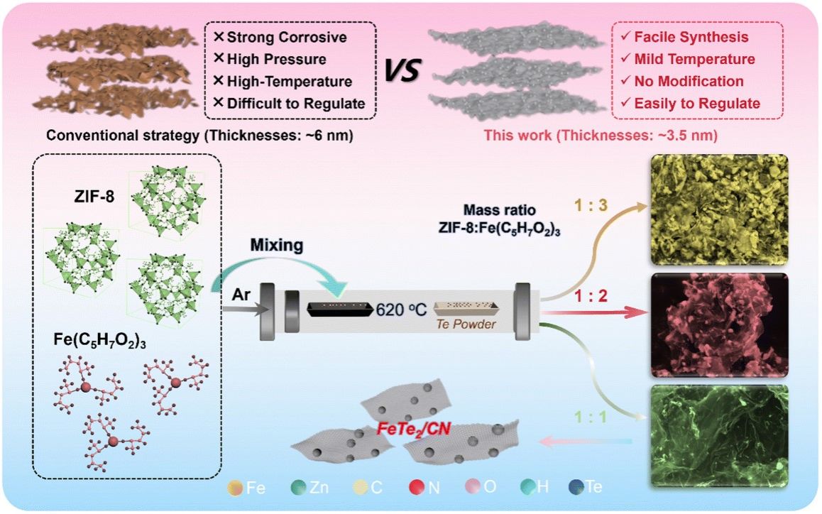 近日,杨大伟团队在《Energy & Environmental Science》(影响因子32.4)杂志在线发表了题为“MOF-derived ultrathin carbon nanosheets integrated with telluride nanoparticles: synergistic polysulfide adsorption and catalytic sites for enhanced sulfur redox reactions”的研究论文。该研究创新性地开发了一种可规模化制备的合成策略:以金属有机框架材料ZIF-8和乙酰丙酮铁为前驱体,通过改进的化学气相沉积法,在碲气氛下进行无表面活性剂参与的温和退火处理,成功制备出负载超细FeTe2纳米颗粒的氮掺杂超薄碳纳米片复合材料(FeTe2/CN)。研究团队将FeTe2/CN作为多功能载硫材料应用于锂硫电池正极,其独特的二维纳米结构不仅提供了高比表面积的硫负载基底,同时FeTe2纳米颗粒与氮掺杂碳基体协同作用,形成稳定高效的催化/吸附双功能位点,显著提升了硫氧化还原反应动力学性能。基于S@FeTe2/CN复合正极的锂硫电池展现出优异的电化学性能。该研究为设计具有高暴露活性位点的二维纳米碳基电催化剂提供了新的方法和思路。