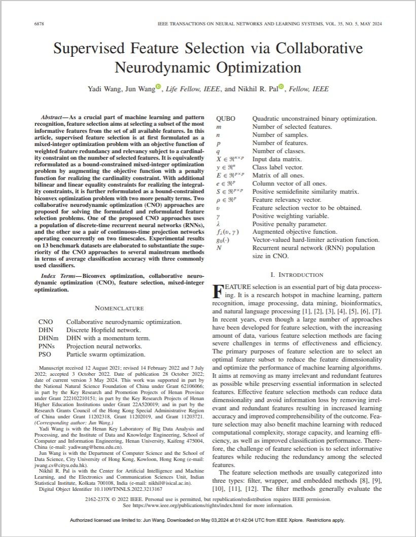监督特征选择是一个混合整数优化问题,目标函数为加权特征冗余和相关性,并受特征数量的基数约束。通过增广惩罚函数实现基数约束,该问题被转化为有界约束的混合整数优化问题。进一步加入双线性和线性等式约束,实现完整性约束后,问题转化为具有两个附加罚项的有界约束双凸优化问题。研究团队提出了两种协同神经动力学优化(CNO)方法,用于解决所提出和重新表述的特征选择问题。其中一种 CNO方法使用离散时间递归神经网络(RNN),另一种则使用在两个时间尺度上同时运行的一对连续时间投影网络。相关成果“Supervised Feature Selection via Collaborative Neurodynamic Optimization”发表在计算机科学学科中科院一区TOP期刊《IEEE Transactions on Neural Networks and Learning Systems》上。