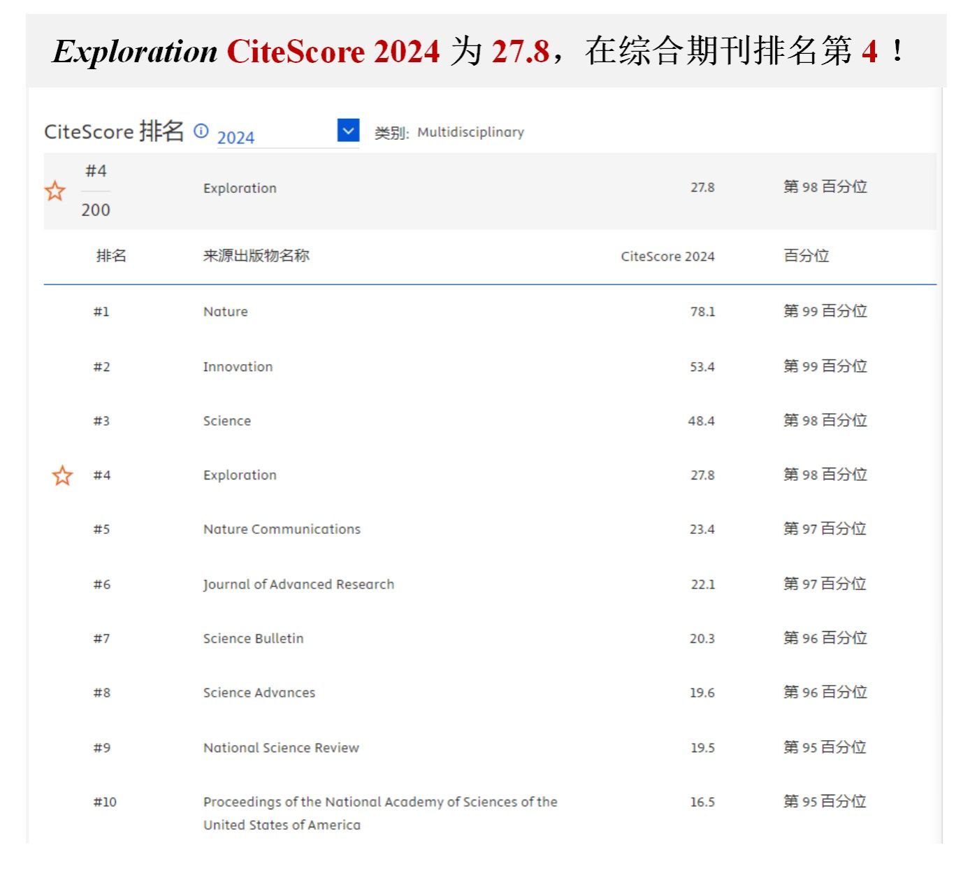 在此次发布中,Exploration在 Scopus 所属 Multidisciplinary(综合类)学科中位列第4位(共200种期刊),进入世界前2%,相较2023年(第9名/171种期刊,Top 5%)显著跃升,排名提升近5位,稳居学科一区。这一成绩标志着 Exploration 在全球综合性科技期刊中的学术影响力和国际认可度迈上了新台阶,成为永利官网“双一流”建设进程中的又一重要成果,也为打造世界一流科技期刊奠定了坚实基础。