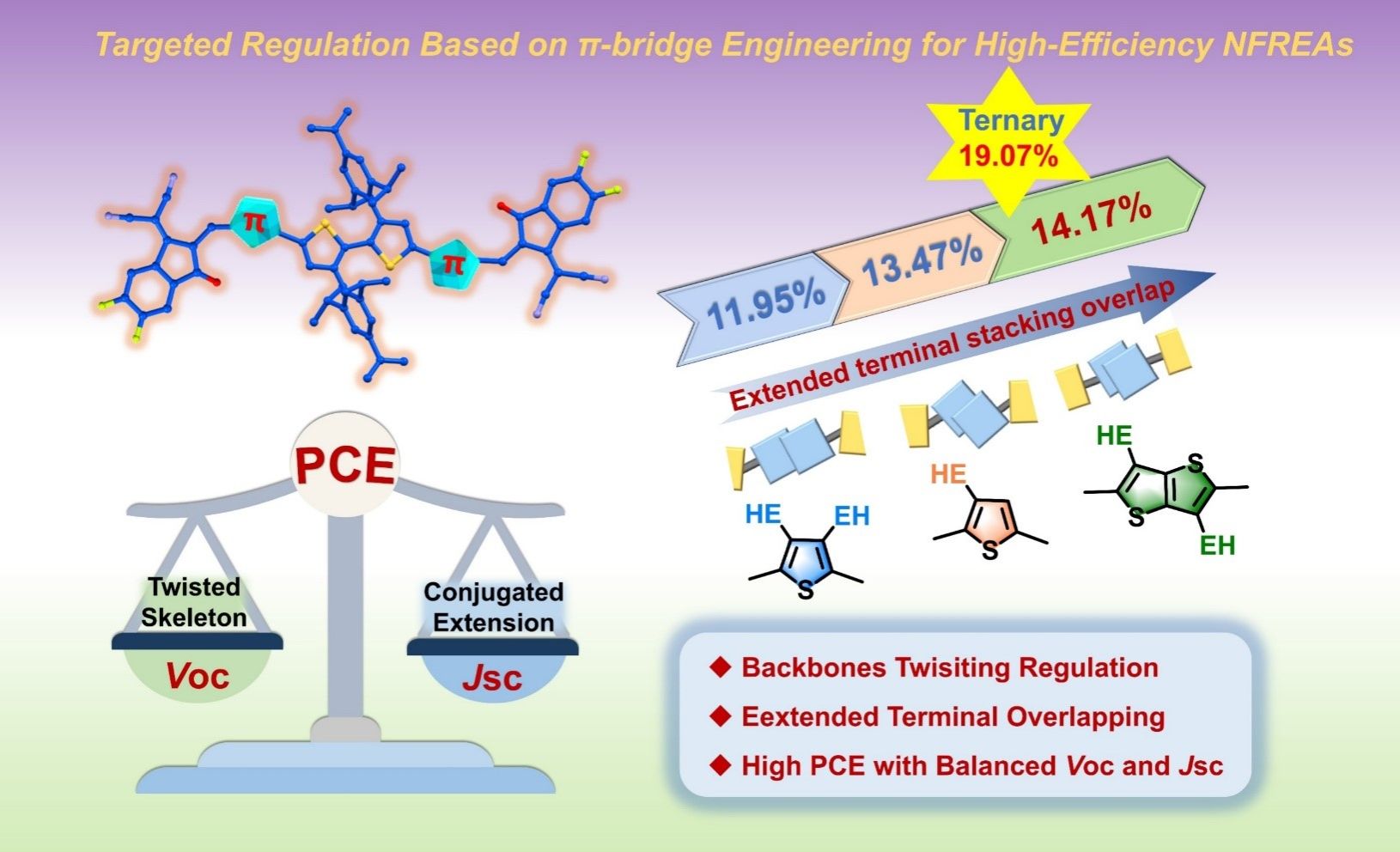 以实现高且平衡的Voc与Jsc为目标,通过引入不同的π桥单元,系统调控π桥上烷基链的数量与取代位置,构建一系列非稠环电子受体,实现了对分子骨架扭曲与端基堆叠面积的精准调控,从而赋予分子高且平衡的Voc(0.916 eV)和Jsc(21.21 mA/cm2),相应的有机光伏器件实现了19.07%的光电转换效率。本研究工作为高性能非稠环电子受体材料的分子设计提供了一种简单有效的策略(Adv. Funct. Mater. 2025, 35, 2423242)。纳米科学与工程研究院硕士生张文军、赵可新为论文共同第一作者,宋金生教授和青岛大学路皓博士为论文共同通讯作者。