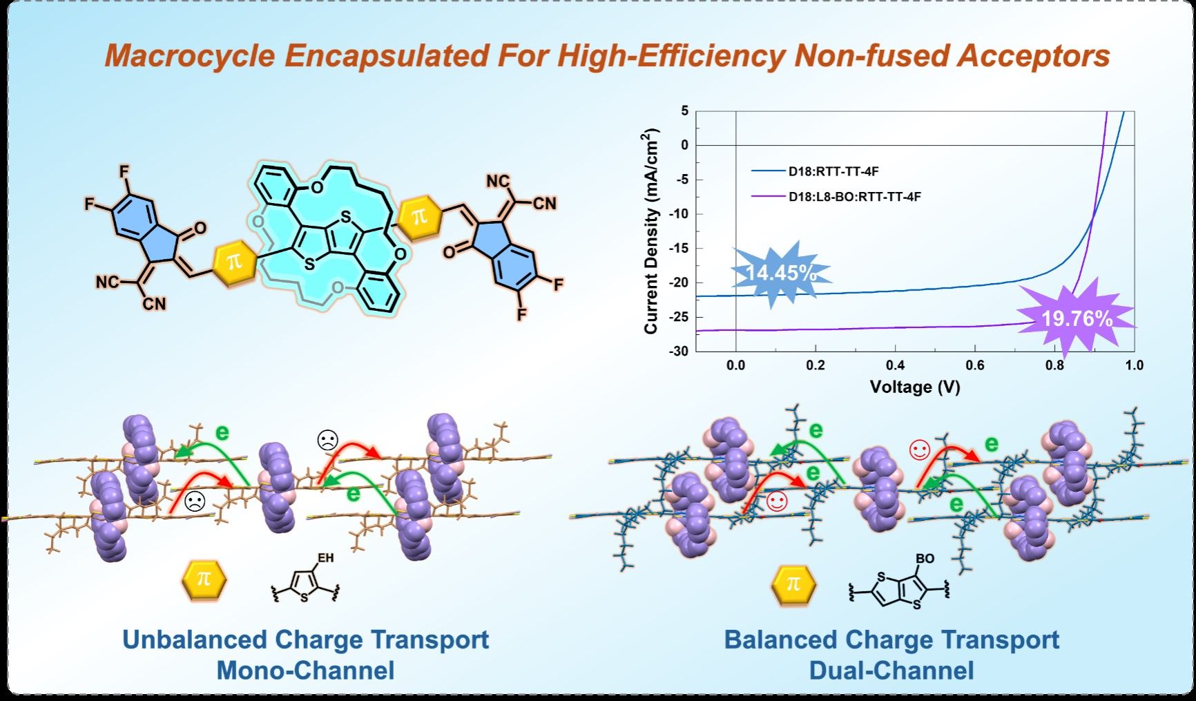 以构建紧密有序的电荷传输通道为出发点,通过课题组前期首创的大环包裹限域策略,结合π共轭骨架的扩展协同调控,设计并合成一系列具有环包裹结构的非稠环分子。研究结果表明,协同的分子设计赋予了受体均衡的双通道电子传输特性,显著提升了电荷传输效率,相应的光伏器件实现了19.76%的光电转换效率,为高性能非稠环受体的设计提供了新的思路(Adv. Funct. Mater. 2025, 35, 2507288)。纳米科学与工程研究院申帅帅博士为论文第一作者,宋金生教授和青岛大学刘亚辉教授为论文共同通讯作者。
