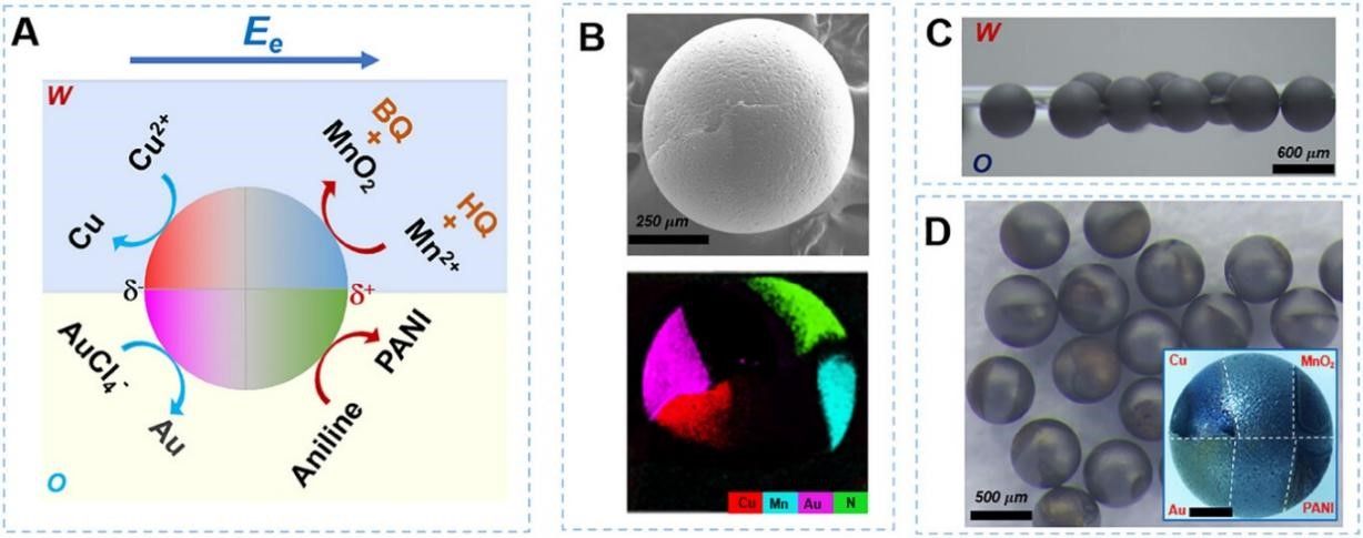 针对上述难题,杨文胜团队创新性地提出了“水/油两相界面双极电化学”策略。该方法通过调控亲水/疏水玻碳微球在油/水界面上的精准定位,并施加平行于界面的电场,在水相和有机相分别诱导不同的电化学氧化/还原反应,从而实现多组分的协同沉积。该策略巧妙结合水/油界面的物理阻隔与玻碳微粒的电子通路,成功实现了Cu、MnO2、Au、PANI等四种功能组分在单一微粒上的同步可控沉积。通过调节电场强度和引入牺牲剂,能够灵活调控各功能区域的位置与比例。该策略不仅首次实现了多组分三维Janus微粒的一步式高效集成,还可扩展应用于二维PEDOT薄膜体系,展现出高度的通用性和拓展性。制备所得多功能Janus微粒表现出丰富的磁响应、pH响应、药物可控释放及特异性荧光标记等功能,为多任务微纳米机器人、生物医学及智能材料的发展提供了新平台。