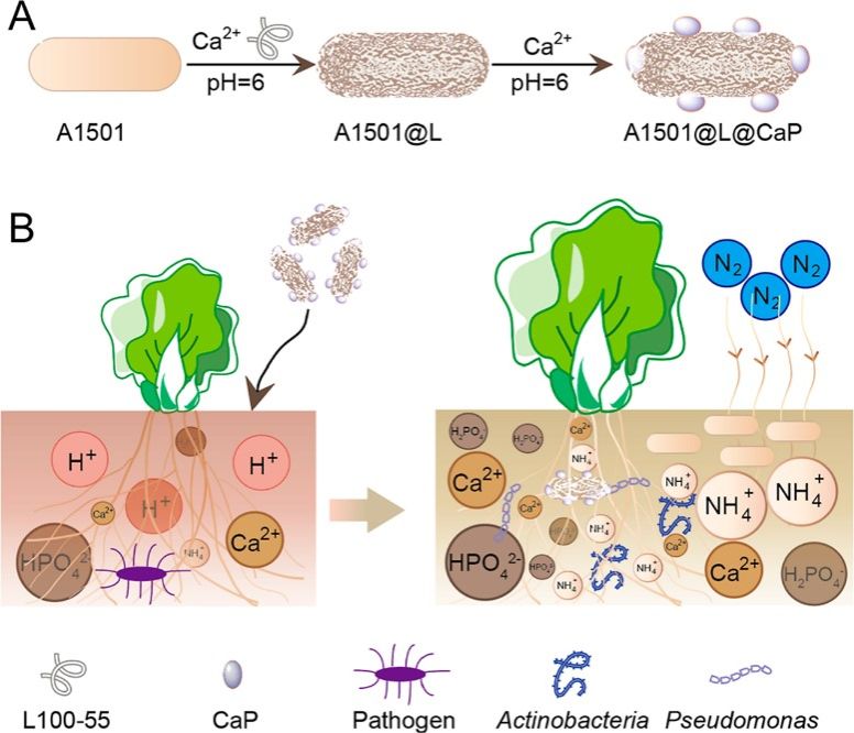 酸性土壤覆盖了全球约30%的土地面积,其中包括超过50%的潜在可耕地,近年来由于氨和尿素等酸性氮肥的过量使用,加剧了土壤酸化,导致土壤中磷、钙和镁等必需营养元素缺乏,已成为全球农业高质量绿色发展的重大障碍。根际固氮微生物能定殖在宿主植物组织内或根际环境中,通过固氮酶将空气中氮气还原为可被植物直接利用的铵态氮素,在农业生产中应用能减少化学氮肥的施用。然而,许多根际固氮微生物对pH值高度敏感,其固氮活性在酸性环境中显著降低。针对上述问题,研究团队以固氮施氏假单胞菌A1501底盘,开发了一种由pH响应共聚物L100-55和磷酸钙纳米颗粒(CaP NPs)组成的活细胞自组装系统,不仅能提升酸性土壤中磷和钙的含量,也能显著增强固氮菌的工作效率。盆栽实验结果表明,这种经过纳米工程改造的新型固氮工程菌株在酸性土壤中保持高效固氮活性,其铵产量达57.52 μg/g cells,同时能有效提升酸性土壤的pH值,增加土壤及其宿主植物中氮、磷和钙的含量,提高宿主作物产量,显示出良好的节肥增产增效应用前景,为解决当前传统生物固氮技术所面临的瓶颈问题提供了切实可行的新方案。
