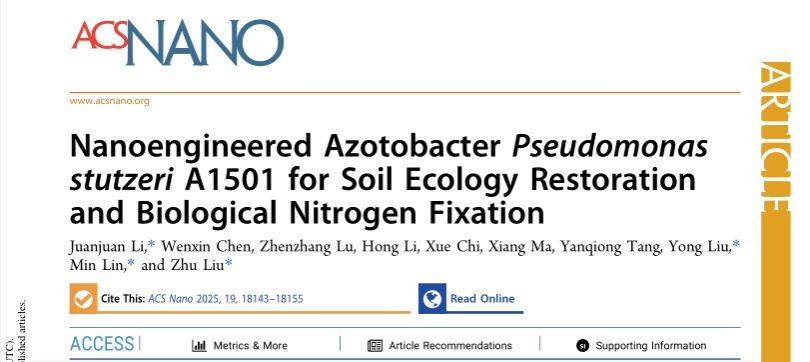 近日,农学院林敏团队与海南大学和云南农业大学相关团队合作,采用纳米工程技术创建一种新型节肥增产增效的固氮工程菌株,能够有效缓冲酸性pH值,改善根际环境养分循环,促进根际固氮效率和宿主植物生长。相关成果以Nanoengineered Azotobacter Pseudomonas stutzeri A1501 for Soil Ecology Restoration and Biological Nitrogen Fixation为题,发表在国际纳米科学期刊《ACS Nano》上(IF=16.2)。