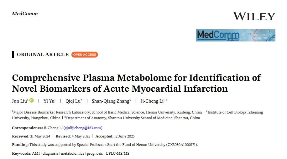 近日,基础医学院李继承教授团队在《MedComm》杂志(IF 10.7,一区Top)在线发表了题为“Comprehensive Plasma Metabolome for Identification of Novel Biomarkers of Acute Myocardial Infarction”的文章。李继承教授为唯一通讯作者,博士后刘俊为第一作者。yl7703永利官网为第一完成单位和第一通讯作者单位。