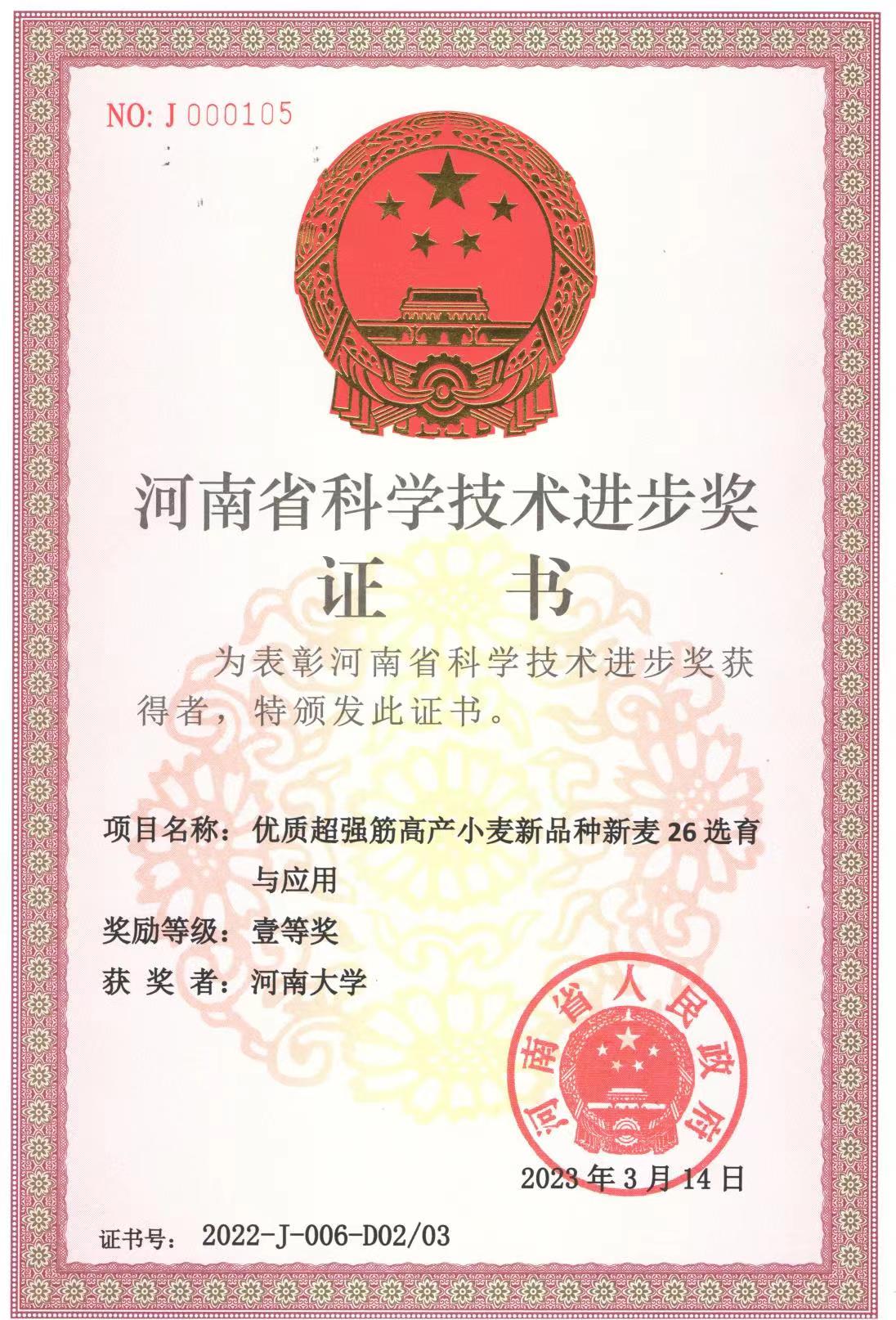 近日,由永利官网与河南省新乡市农业科学院联合申报的“优质超强筋高产小麦新品种新麦26选育与应用”荣获河南省科学技术进步奖一等奖。
