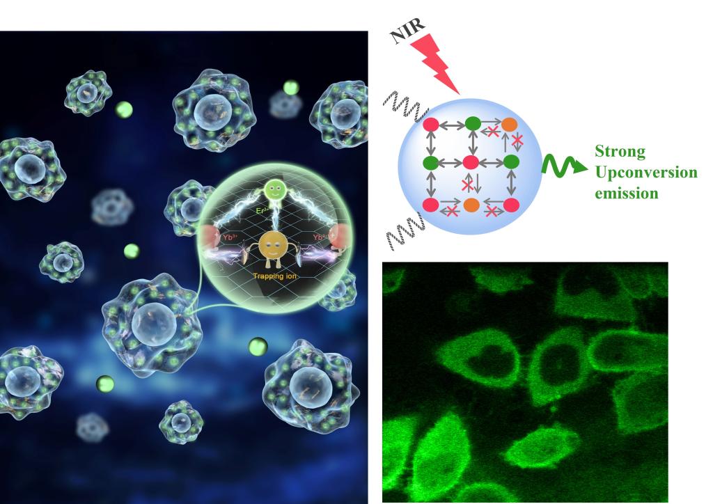 UCNPs由于诸多独特的光学特性,在生物医学领域受到越来越多的关注,但由于它们的尺寸太大(通常为20 nm),无法应用于亚细胞成像。如果想应用于亚细胞成像,通常需要UCNPs的尺寸要小于10 nm。随着纳米颗粒尺寸的减小,表面淬灭效应急剧上升,发光亮度呈现指数倍衰减。为了解决纳米颗粒尺寸和发光亮度之间的矛盾,本工作首次提出利用能量捕获离子来抑制光活性离子之间的能量迁移,在不增加纳米粒子尺寸的情况下,就可以有效阻止表面淬灭效应,增强上转换发射强度。加入能量捕获离子Tm3+,合成了UCNPs,NaYF4: 50% Yb, 2% Er, 0.5% Tm。与不加入Tm3+离子相比,上转换发光强度增强了3.2倍。利用该种策略合成了尺寸为5 nm的NaGdF4: 30% Yb, 2% Er, 0.3% Tm纳米粒子,仍然可以保证优异的发光强度,而且使用这种方法制备的上转换纳米颗粒还具有优异的抗水诱导淬灭能力,实现了前所未有的高质量细胞标记和成像。为上转换纳米颗粒在生物领域的应用提供了可行性的方案,为实现更高水平的亚细胞研究铺平了道路。