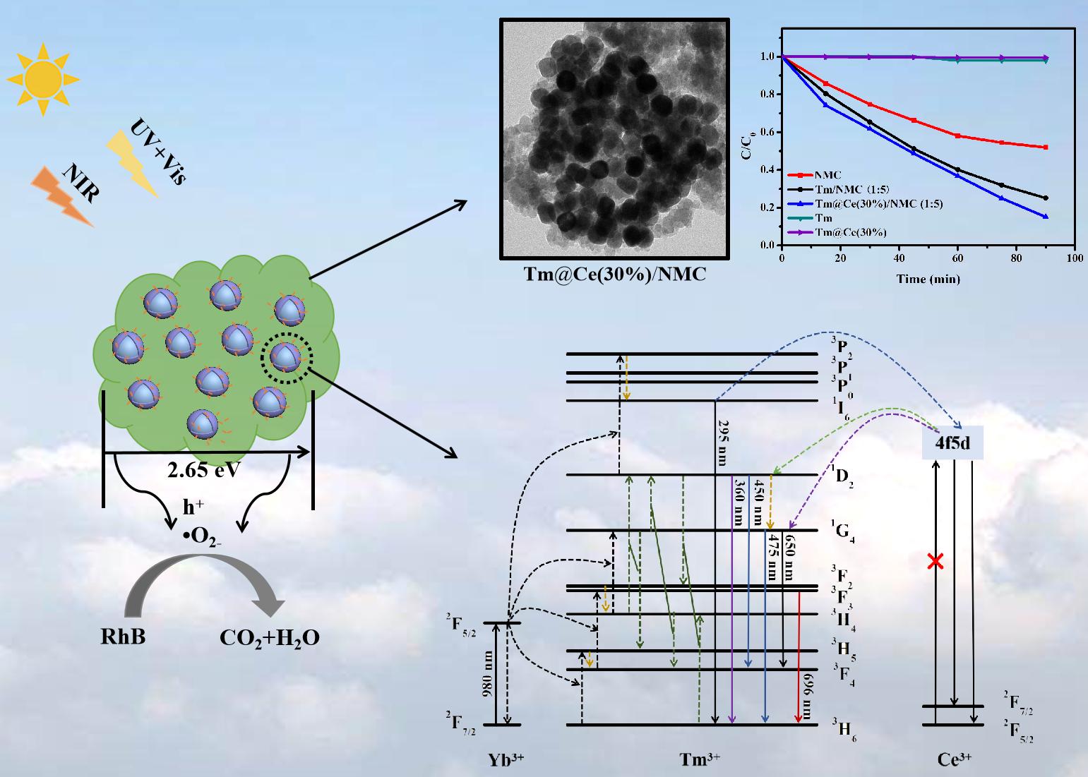 能源短缺和环境污染是当今社会面临的两个主要问题,用光催化法降解有机污染物被认为是同时解决上述两个问题行之有效的方法之一。光催化剂的研究工作一直是广大科研工作者关注的焦点,其核心问题是如何提高光催化的活性。金属有机框架(MOFs)化合物和半导体是最常见的光催化剂,但是它们的吸光范围一般都在紫外区或者有限的可见光区域。为了充分利用太阳光,特别是占整个太阳光谱50%的近红外光,开发上转换纳米颗粒(UCNPs)与MOFs或半导体相结合的光催化剂已经势在必行。针对以上问题,王丽教授和张敬来教授课题组设计合成了一种新型复合光催化剂NaYF4:Yb,Tm@NaYF4:Yb,Ce/NH2-MIL-101 (Cr) (Tm@Ce/NMC),成功控制了核壳结构的尺寸并促进了核壳之间的能量传递。掺杂Ce离子的核壳异质结构不仅有利于提高荧光发射强度,还利于电子-空穴的分离。该光催化剂分别在模拟太阳光、UV+Vis和NIR下对罗丹明(RhB)进行降解,都显示出优异的光催化降解效果。此复合光催化剂的成功研制为设计核壳之间具有有效能量转移的新型光催化剂提供了新的思路。