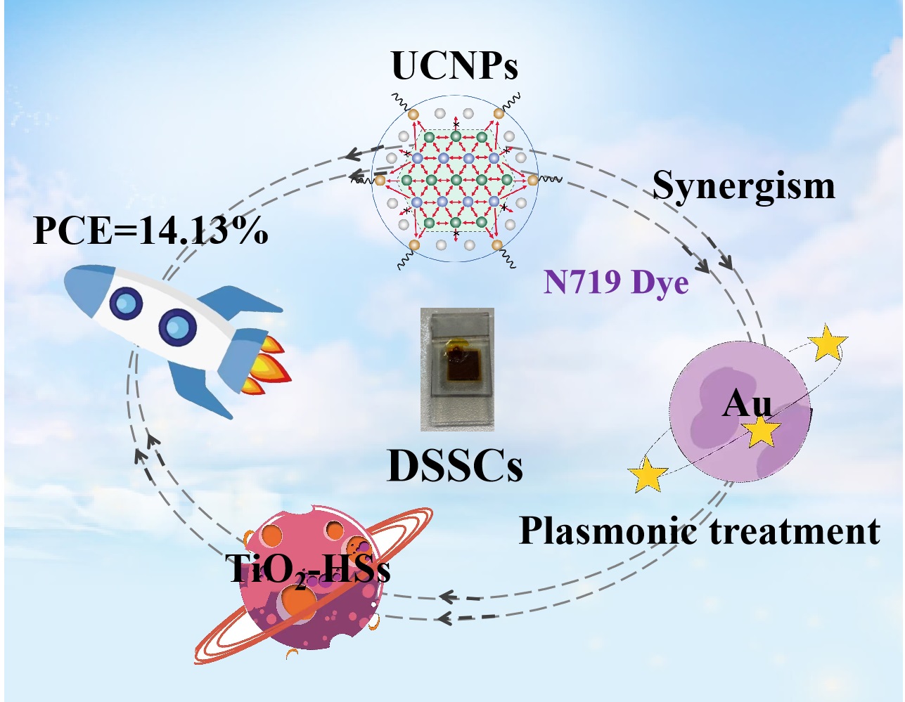染料敏化太阳能电池(DSSCs)因其成本低、制备简单、光电转换效率较高等优点,成为极具应用前景的新一代光伏设备。目前,DSSCs器件已经实现了高达14.3%的光电转换效率,但是基于N719染料的DSSCs的光电转换效率仅为11.5%左右。鉴于此,本工作设计了一种包含P25纳米颗粒、TiO2空心球(TiO2-HSs)、Au纳米颗粒(AuNPs)和NaYF4:Yb,Er@NaLuF4:Eu@SiO2上转换纳米颗粒(Er@Eu@SiO2UCNPs)的多功能复合光阳极材料,大幅提升了DSSCs的光电性能。该复合光阳极以P25为透明层,以TiO2-HSs和Er@Eu@SiO2UCNPs为光散射层,显著拓宽了N719染料的吸光范围。通过简单的等离激元处理,在光散射层薄膜上原位生长AuNPs,进一步增强了N719的光吸收能力。在此,使用紫外光触发AuNPs的表面等离子体共振(SPR)效应,SPR场增强效应不仅加快了光阳极材料的反应进程,还促使UCNPs吸收更多的红外光。此外,AuNPs产生的晶体缺陷也阻止了电子与空穴的重组。研究表明,制备的多功能复合光阳极不仅具有良好的兼容性,还在模拟太阳光下收获了14.13%的光电转换效率,这是目前使用传统N719染料作为敏化剂的DSSCs的最高效率。值得注意的是,经过180 h的稳态测试后,电池的光电转换效率仍然保持95.33%,表现出良好的设备稳定性。这种多功能复合光阳极的独特设计为研究其多组分之间的协同作用机制以及开发具有广泛应用前景的新型光阳极材料提供了一种新的途径。