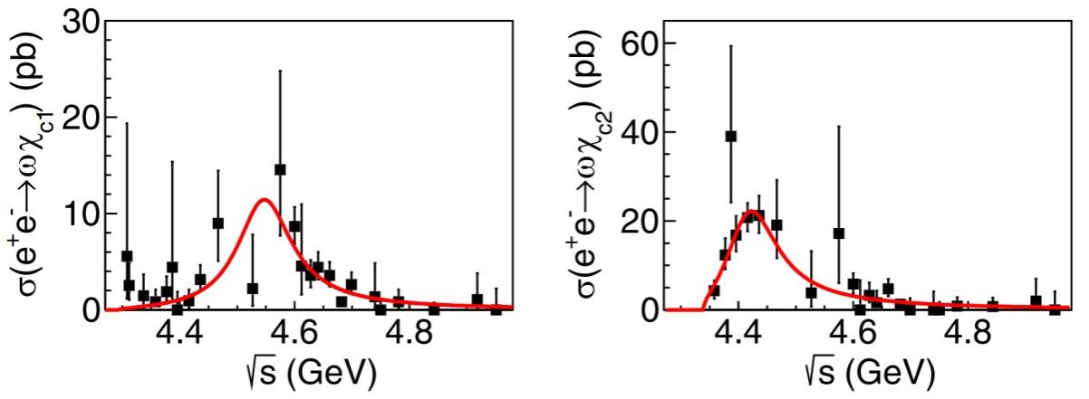 图1 e+e-→ωχc1(左图)和e+e-→ωχc2(右图)截面的拟合结果,两个显著的结构被观测到