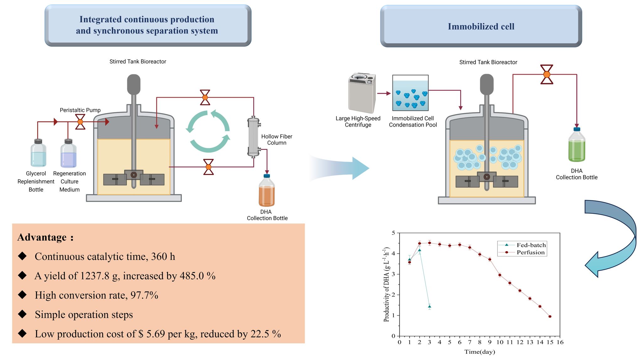 该研究利用中空纤维柱灌流技术和固定化细胞构建了一种新型的连续生产和同步分离(ICSS)集成系统(图1),并对细胞的时序寿命进行了研究,发现添加酵母提取物和硫酸镁可以复苏细胞的生物催化能力,实现DHA长期的高效率生产。同时该研究结合恒化器的理念构建了相应的动力学模型,增加固定化细胞用以处理未消耗的甘油,降低成本的同时大大提高了下游结晶纯化效率(图2)。在最佳运行条件下,利用高效微生物连续催化生产技术新策略,使DHA产量提高4.85倍,大大提高了DHA的生产效益。ICSS系统不仅适用于DHA的生产,还可应用于其他物质的连续化生产工艺开发,在可持续生物生产过程中具有很大的应用潜力,为利用微生物进行工业高附加值产品生产提供了一种新的思路。