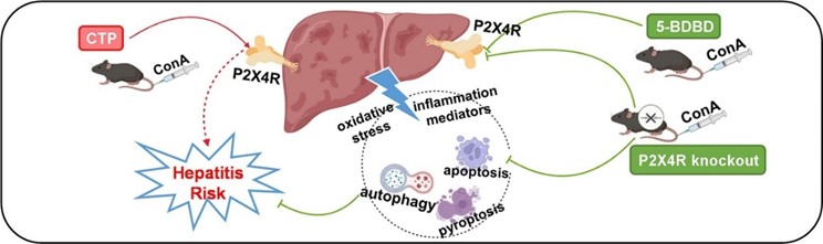 另外,王军朋团队在前期研究中发现P2X4R缺失通过改变肠道菌群进而加重炎症性肠病的发生(P2X4 receptor modulates gut inflammation and favours microbial homeostasis in colitis, Clinical and Translational Medicine, 2023),在此基础上,该团队利用P2X4R−/−小鼠及P2X4R抑制剂和激活剂探讨了P2X4R在缺失及激活状态下在急性肝损伤中的作用。研究证实,Con A诱发的AIH上调了肝组织中P2X4R的表达,且与血清中ALT和AST呈正相关。P2X4R缺失缓解了Con A诱发的AIH,但不影响药物和毒素诱导的急性肝损伤。进一步证实了消除P2X4R,通过抑制炎症因子、调节氧化应激平衡及改变相关凋亡途径和自噬而实现对免疫介导的急性肝炎的保护作用(图2)。研究表明抑制或激活P2X4R可以影响自身免疫性肝炎的发生。该研究证实靶向调控P2X4R可以发挥治疗自身免疫性肝炎的作用,明确其可能的作用机制涉及到调控程序性细胞死亡机制,为治疗自身免疫性肝炎提供新靶点。相关研究成果以“Deficiency of purinergic P2X4 receptor alleviates experimental autoimmune hepatitis in mice”为题发表在Biochemical Pharmacology期刊上。