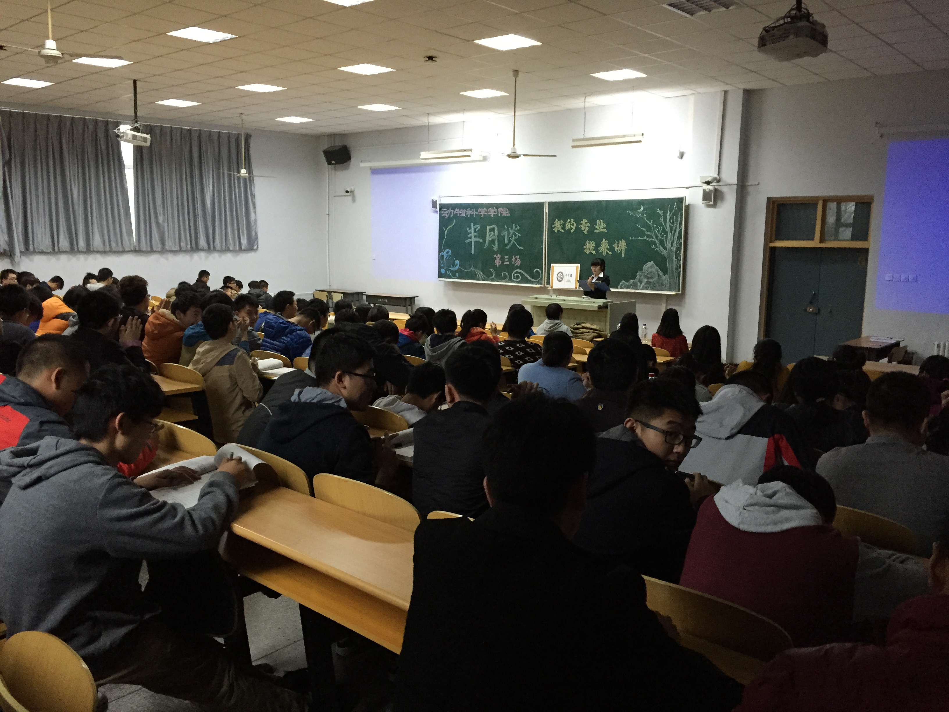2015年4月2日,周四下午四点,米乐mile官方网站2014级全体本科生齐聚科学讲堂200教室,以热烈的掌声欢迎本期嘉宾2011生物技术(动物)专业的王一名学姐和2012级生物技术(动物)专业的吴志竞学姐参加本次分享会。