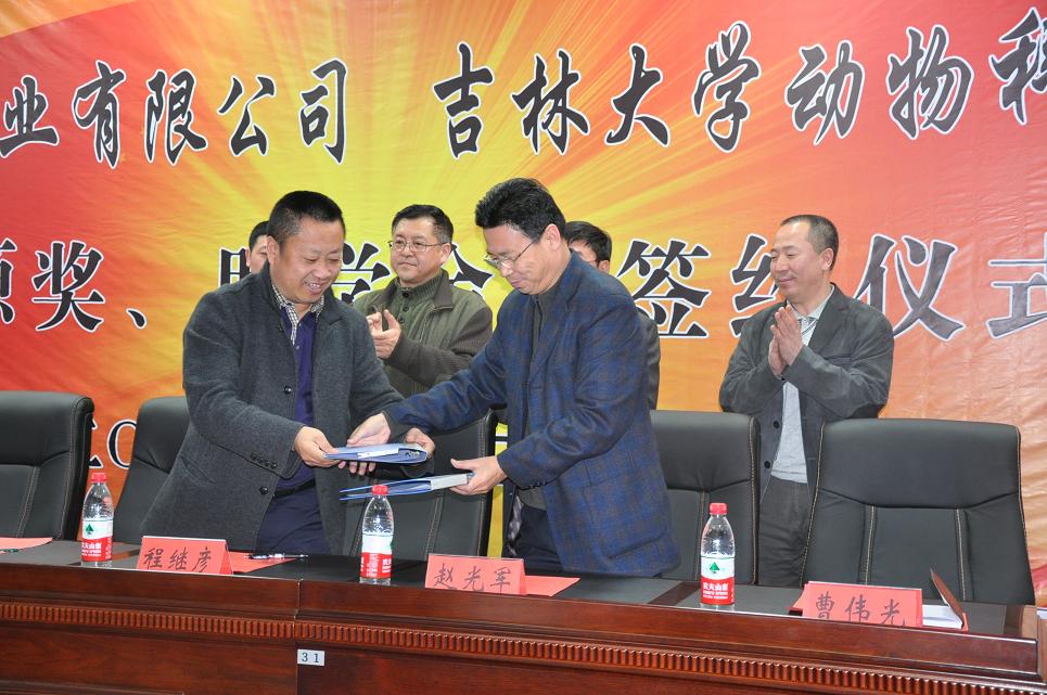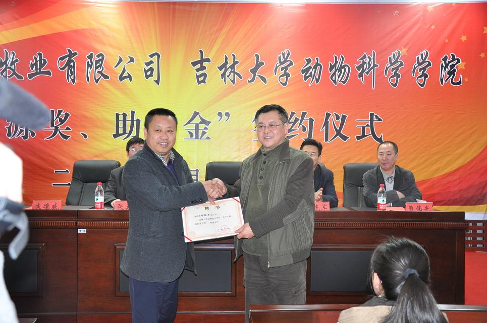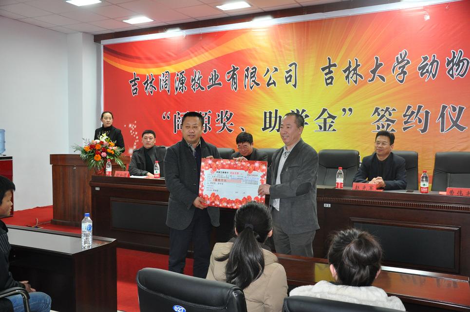 仪式上赵光军书记代表学院与吉林阔源牧业限公司总经理程继彦共同在“阔源奖、助学金”协议书上签了字。随后曹伟光副书记代表学院接受了吉林阔源牧业限公司捐赠的支票,并为程继彦总经理颁发了捐赠证书,至此“阔源奖、助学金”项目正式启动。根据协议,吉林阔源牧业限公司每年出资20000元用于资助奖励品学兼优、立志成才的动科学子,资助年限为5年。仪式上,程继彦总经理还被聘请为“大学生校外职业导师”,朱德威处长为他颁发了聘书。