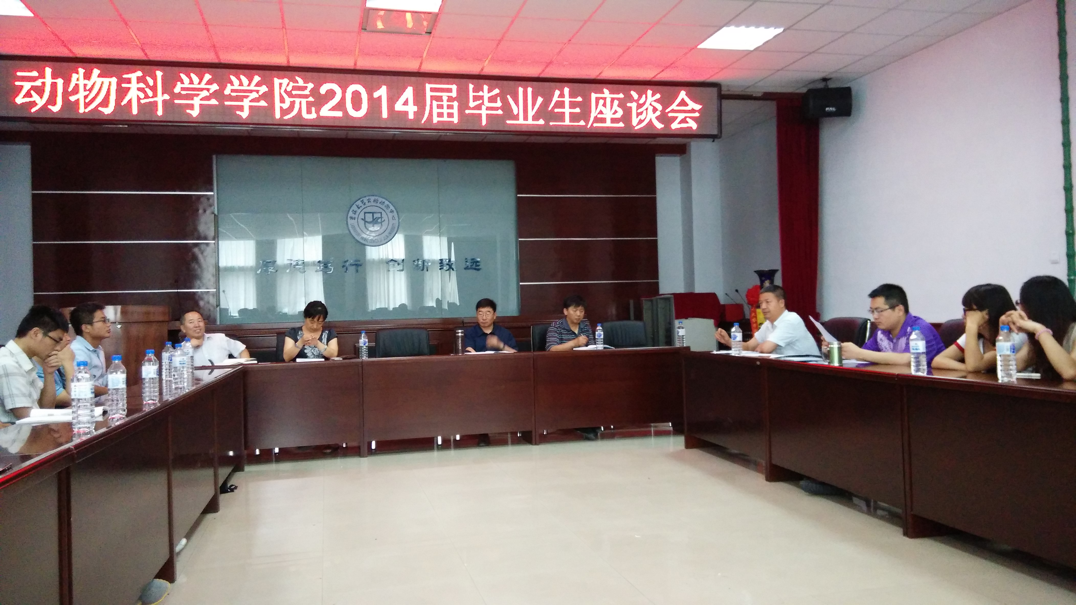 2014年6月23日下午2:00,米乐mile官方网站2014届毕业生座谈会在学院一楼会议室举行,此次座谈会以“心系动科,共谋学院长足发展”为主题,由学院党委副书记曹伟光主持,院长张嘉保教授,副院长任文陟教授,副院长于景海老师,生物技术系主任逄大欣教授,动物科学系主任沈景林教授,实验动物系党支部书记袁宝老师,各办公室主任、毕业班辅导员及14名优秀毕业生代表均到场参加。