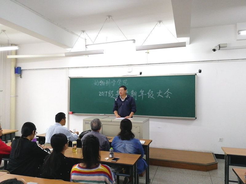 会议开始,首先由教学副院长孙博兴向全体人员介绍了关于大二上学期动科专业分流和“卓越农林培养”计划选拔的大体情况,还告诫学生们抓好自身学习和个人素养的培养,不要心存侥幸,踏实走好每一步。紧接着,教学办主任马骥超老师就孙院长提出的分流问题和“卓越农林”培养计划具体进行了进一步的阐释。详细为学生们宣读了2017级动物科学本科生专业分流要求,并解释了志愿如何填报和后续入选的问题。之后学生们深入了解了“卓越农林”培养计划的项目,实施和人员的选拔的方法,收获颇多。然后,17级辅导员肖建荣老师宣读了17级本科生第一学年成绩状况并重点强调了挂科的问题,希望在新一学期,树立严谨的学术学风,各班委负起责任,对此次的成绩进行反思,带领同学们圆满完成这一学期的英语四级任务,并且提出不挂科的要求。肖老师还特意指出学生干部更应该建立起榜样作用,做好学生工作的同时,抓好自身的学习。最后,党委副书记曹伟光对会议进行了总结,对第一学年的挂科率与全校平均水平进行对比,指出同学们学习上的问题,鼓励学生们不畏失败,努力前行,不辜负自己美好的大学时光。