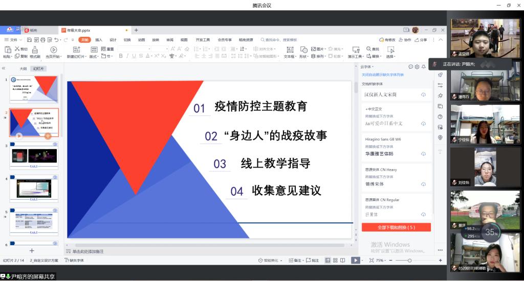 接下来,辅导员尹暄齐组织同学一同观看了身边人战“疫”故事短片,片中为我们展现了日常生活保障的志愿者、后勤工作者的风貌,增强了同学们共同抗疫、众志成城的决心。同学们也分享了隔离以来自己做志愿者的经历。从一开始的短暂慌乱,到克服过程中的各种困难,再到听到一声声“谢谢”的成就感、幸福感,孟益铎同学说,这是“甜蜜的”,孙艺嘉同学说,这是“温暖的”,李东梦、李杰同学说,这是“感动的”。此外,同学们提出隔离时期学习、生活上的困难和问题,辅导员尹暄齐表示,一定会沟通各方,尽力解决,同时也鼓励同学们克服困难,共度时艰。