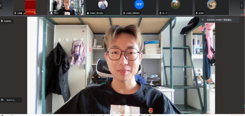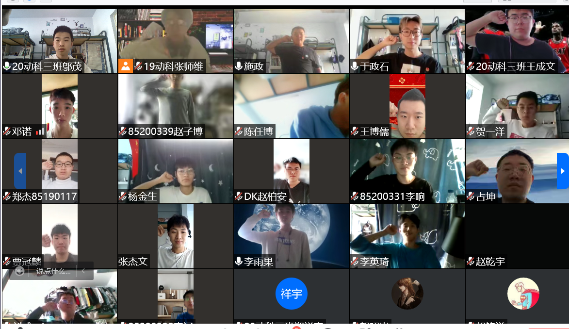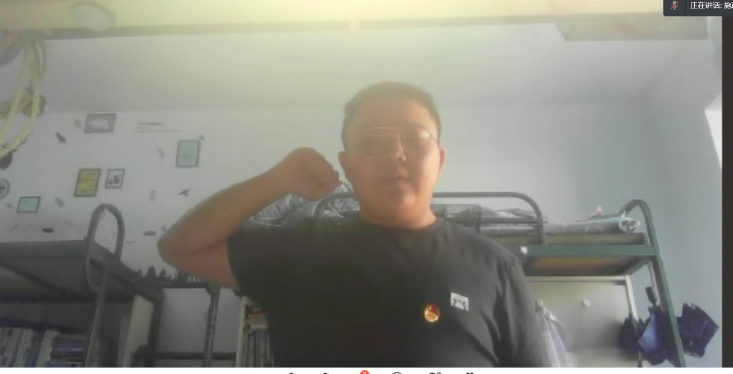 大会的第四项,由团支部委员施政同学带领全体团员重温入团誓词。即便是在线上,全体同学仍然起立,打开摄像头,举起右拳,在施政同学的带领下庄严地重温入团誓词。