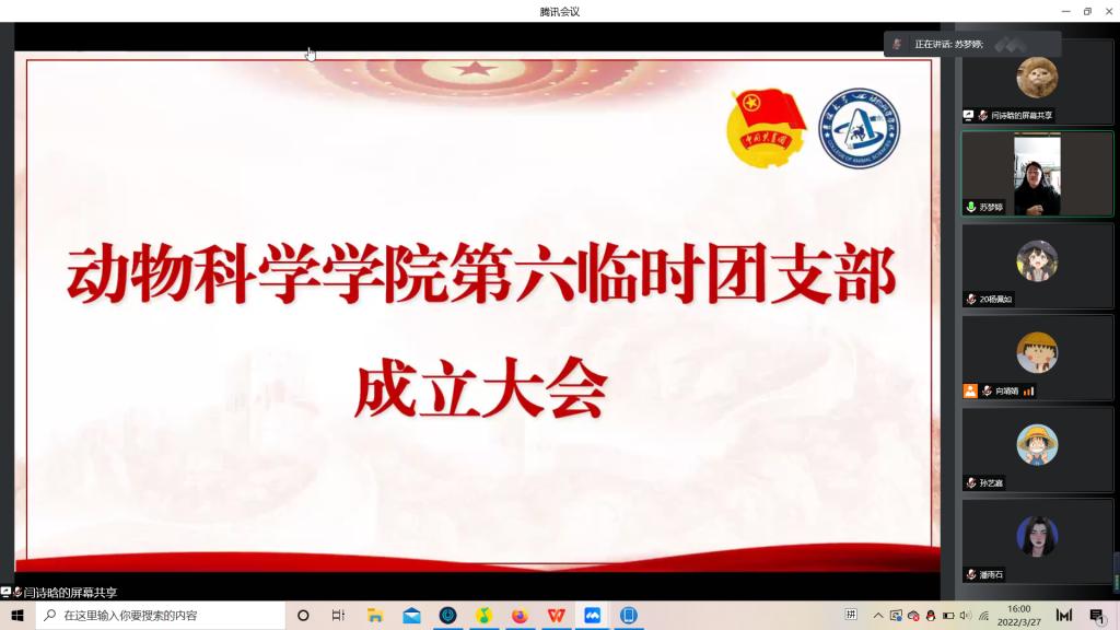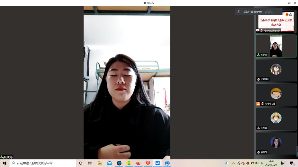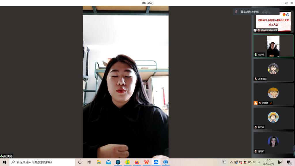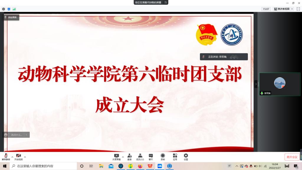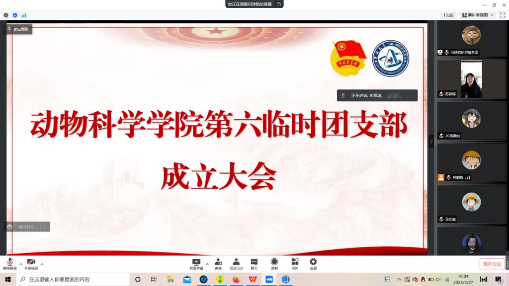 为积极响应校团委号召,强化团的基层建设,切实发挥共青团组织在防疫控疫工作中的战斗堡垒作用及团员的先锋模范作用,落实《关于疫情防控期间成立临时团支部的通知》的工作安排,米乐mile官方网站第六临时团支部成立大会于3月29日下午四点由支部书记苏梦婷主持召开。支部全体成员即2018级、2019级实验动物班和2020级一班和平二公寓共34名同学参会。