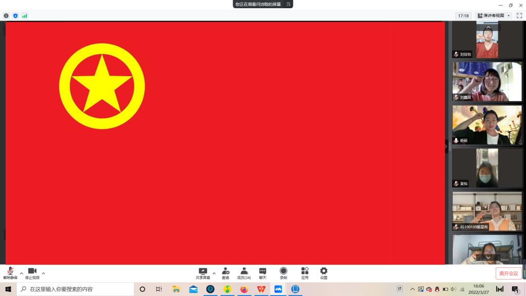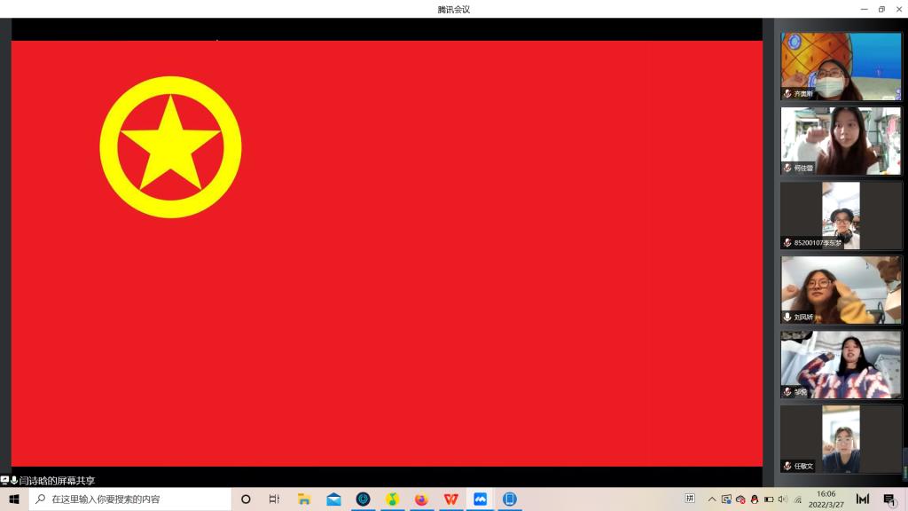 随后,积极参与到本次疫情防控志愿服务工作中的两位团员代表向大家分享了心得,于淞同学首先发言分享了自己参与志愿工作中所感受到的大家共抗疫情的坚定决心,并提出吉林终有吉临时,长春定复往常春的美好期待。李双瑞同学分享了自己在工作中和同组志愿者的故事,大家互帮互助,在自己的能力范围内,尽可能承担更多的的工作,更好的配合学校,满足大家的生活需求。会议结尾,由支部委员闫诗晗带领支部全体成员在团旗下高举右手紧握右拳庄严宣誓。
