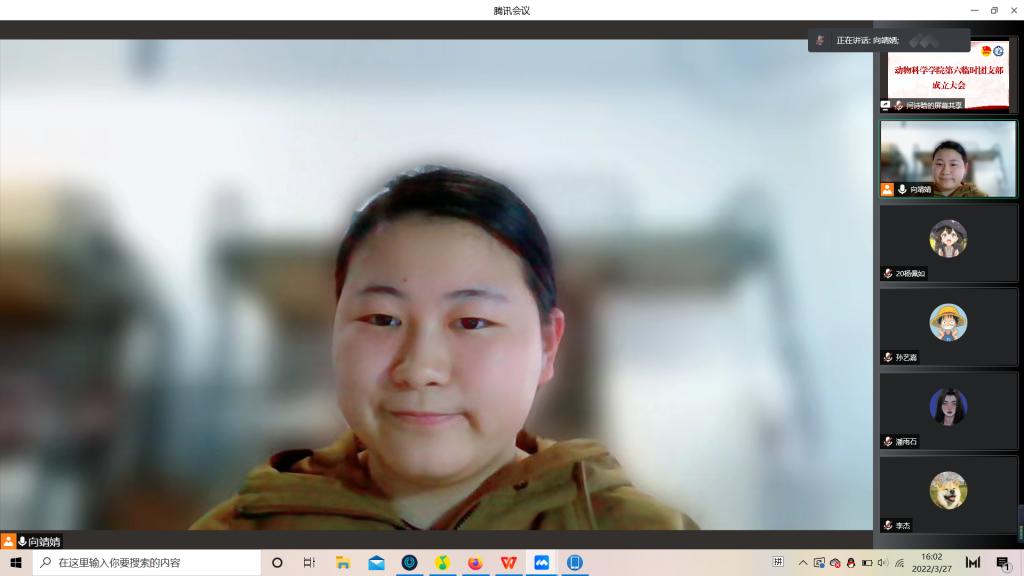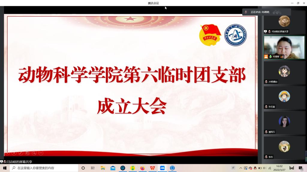 会议第二项,由团支部副书记向靖婧公布学院指派临时团支部委员名单:2018级实验动物班苏梦婷担任米乐mile官方网站第六临时团支部支部书记,2019级实验动物班向靖婧为团支部副书记,组织委员和宣传委员分别由2019级实验动物班闫诗晗和2020级一班杨佩如同学担任。