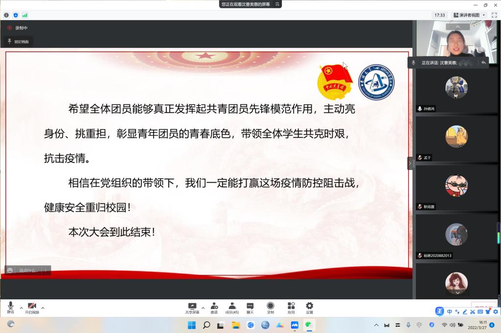 最后,团支部书记沈曹美惠同学传达了会议精神:在这特殊时期,作为共青团的一份子,要勇于彰显青年团员的青春底色,带领全体学生共克时艰,抗击疫情。岁月因青春慨然以赴而更加美好,世间因青年挺身向前而更加瑰丽,党旗所指,团旗所向,同心抗疫,吉大有我!