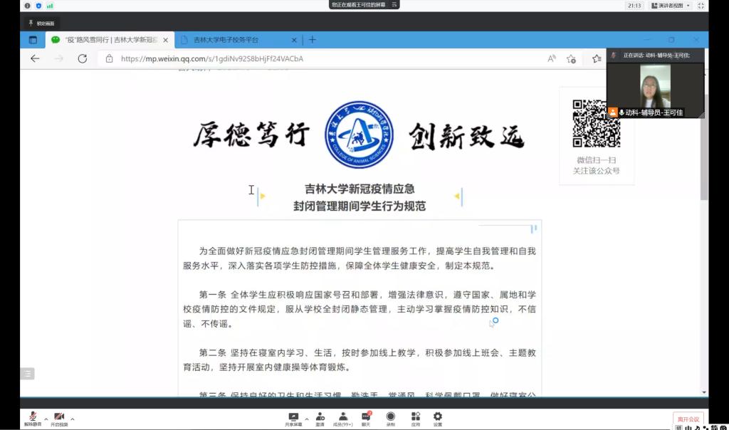 为全面做好新冠疫情应急封闭管理期间学生管理服务工作,深入落实各项学生防控措施,保障全体学生健康安全,4月5日晚,米乐mile官方网站2021级本科生组织召开了以“守望相助,共克时艰”为主题的年级大会。会议由辅导员王可佳主持。