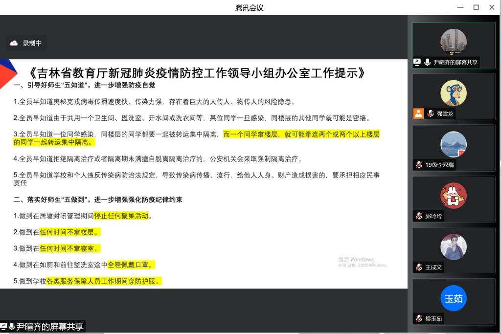 会上,辅导员尹暄齐老师首先向同学们解读吉林省教育厅新冠肺炎疫情防控工作领导小组办公室工作提示,即要求同学们了解遵守“五知道、五做到”。随后,尹暄齐老师就目前每日健康打卡的情况进行通报并落实相关工作安排,强调每位同学要对此高度重视,及时打卡。最后,他强调:全体同学应体谅志愿者工作的不易,尤其是学生干部和学生党员要明确身份、以身作则,在疫情防控工作中带头遵守疫情防控的各项管理规定,积极参加各公寓的志愿服务,展现担当精神,让青春之花在抗疫一线绽放。