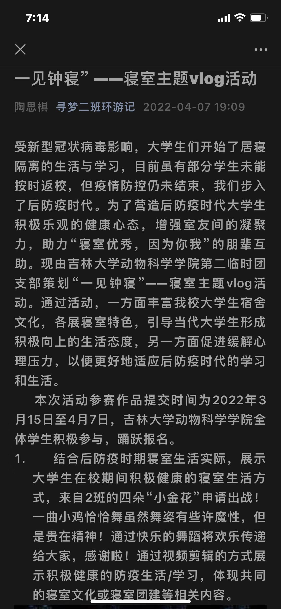 为应对突如其来的疫情,我校进入封闭管理模式。为了帮助大家保持积极向上的心态,增强室友之间、同学之间的的凝聚力,米乐mile官方网站第二临时团支部于2022年4月举办了“一见钟寝”主题vlog团日活动。