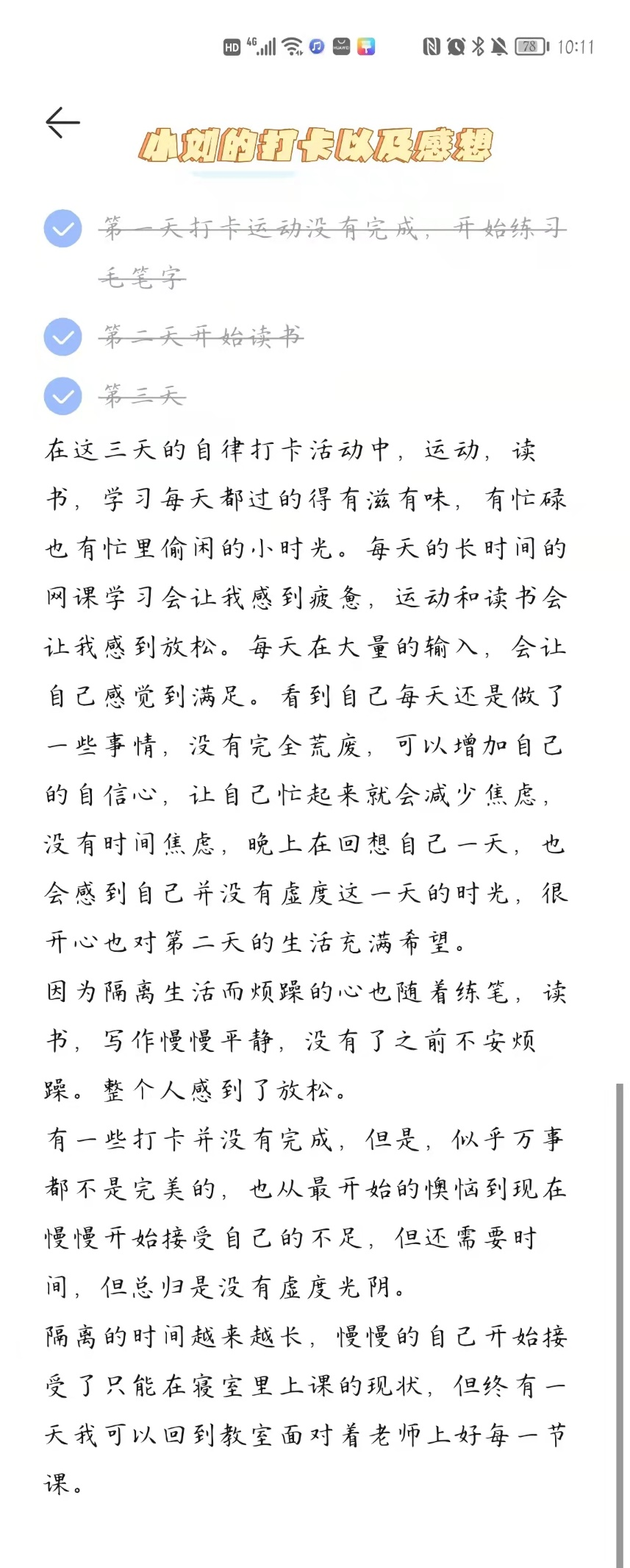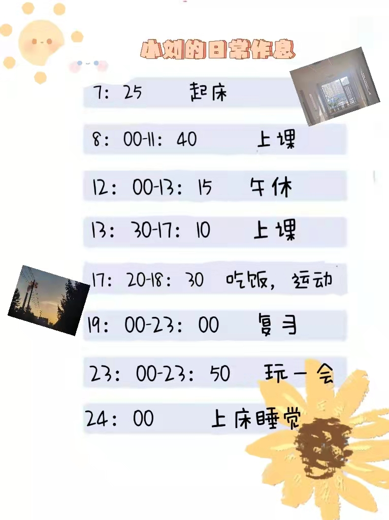 在打卡活动中,同学们认真按照自己的计划严格执行,并相互监督,在寝室内坚持运动、学习,劳逸结合,按时打扫寝室卫生,保持寝室环境的干净整洁。来自104寝室的三位同学共同商议制作了一份计划打卡表,在进行打卡时,三位同学相互鼓励,坚持完成每日计划,并进行每日总结;而来自108寝室的孟同学,更加灵活地规划了自己的时间并注明了活动目的,在她的计划中,“早睡”也是重点之一。她在感想中写道:“好好爱护自己的身体,找到一种更好的方式与它共处,你不仅可以收获健康的体魄,还能拥有充满力量的身体。早睡就是一种不错的选择,什么时间就履行什么样的职责。”