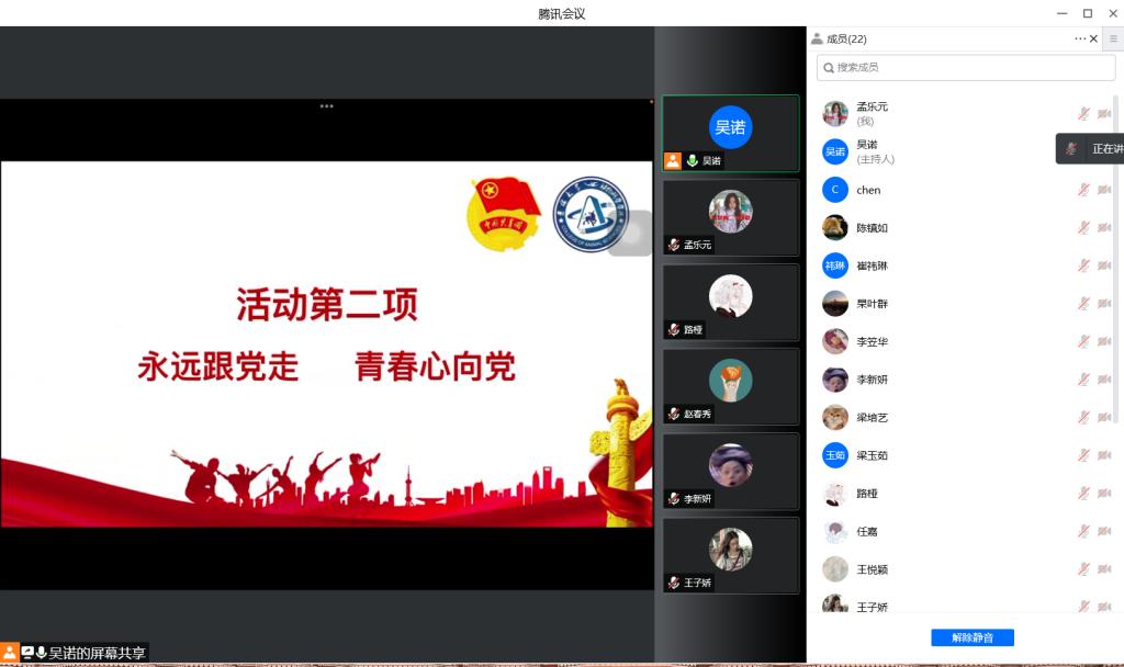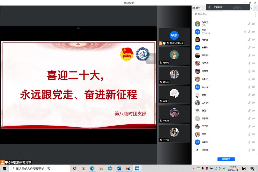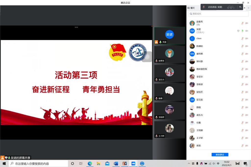 今年是中国共产主义青年团成立一百周年,是党的二十大召开之年,也正是抗疫防控的关键时刻。为贯彻落实“两会”精神,迎接二十大召开,引领广大团员青年坚定跟党走、成才报国信念,教育广大团员青年遵守疫情防控要求,2022年4月3日,米乐mile官方网站第八临时团支部开展“喜迎二十大、永远跟党走、奋进新征程”主题团日活动,米乐mile官方网站第八临时团支部全体同学积极参与本次活动。活动由团支书吴诺主持。