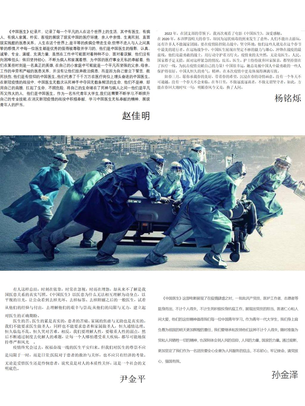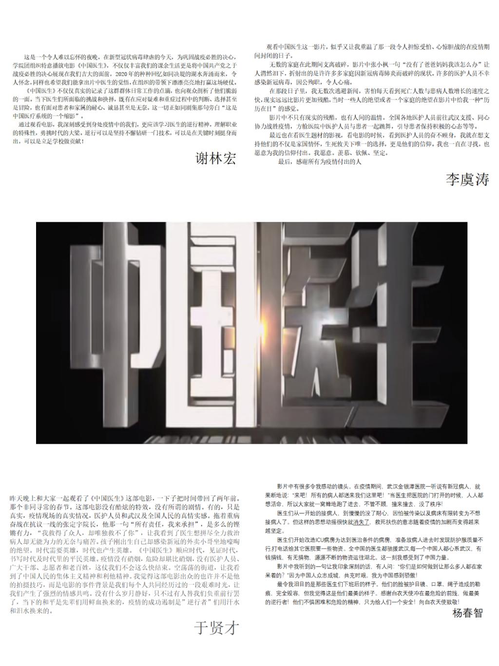 郭冠希同学同样心潮澎湃,“终于,怀着复杂的感情,我观看了《中国医生》。看完这部电影,去年的那一幕幕场景,再次萦绕在脑海里,无法让人不动容。我认为《中国医生》最令我感动的是真实。没有对这场可怕的疫情进行掩饰,而是真实地还原了武汉抗疫的情况。让我看到了,在面对未知病毒时,人类本能的恐惧,对生命的渴望。“我救得了众人,却唯独救不了你”,让我看到了医生想拼尽全力救治病人却无能为力的无奈与痛苦。空荡荡的街道,让我看到了中国人民的集体主义精神和利他精神。我觉得这部电影出众的也许并不是他的拍摄技巧,而是电影的事件背景是我们每个人共同经历过的一段艰难时光,让我们产生了强烈的情感共鸣。当看到老张在救治成功后又去世后,我很难过,是对生命逝去的惋惜。可当我看到婴儿成功出生后,我内心无比的激动,那是新生的希望,是生命的延续。在这部电影中,一句“没有爸妈的孩子该怎么办”戳中了无数人的泪点;一句“我孩子刚出生,我不能有事”让多少父母流泪:一句“你就是那个不救我的医生”又让多少医生扎心……“风雪肆虐的季节,因为团结,温暖从未缺席”。在党中央的一声号令之下,无数的医护工作者奔赴前线,义无反顾去到祖国需要他们的地方。全国人民团结一致,向世界展现了什么叫中国力量。在这场疫情的战役中,每个人都作出了贡献,总有很多人每时每刻温暖着我们,感动着大家,同时带给大家战胜疫情的力量和信心。”