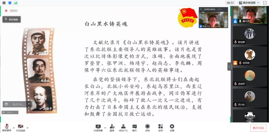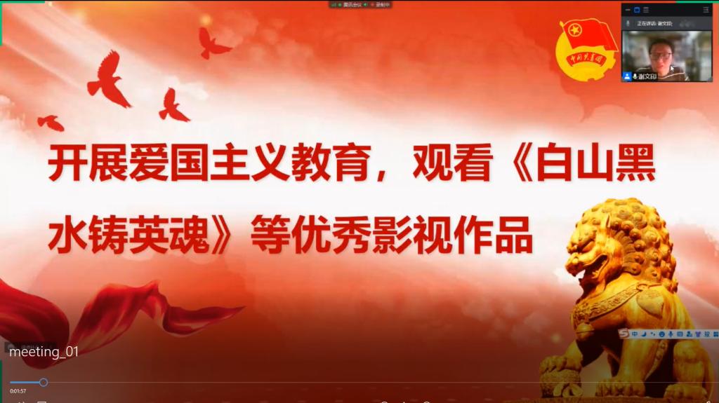 为丰富同学们隔离期间的生活,缓解学生的心理压力,弘扬主旋律、传递正能量,米乐mile官方网站第三临时团支部积极响应团组织号召,于4月10日通过腾讯会议线上开展了爱国主义教育观影活动,组织观看了《白山黑水铸英魂》《人世间》等优秀影视作品。