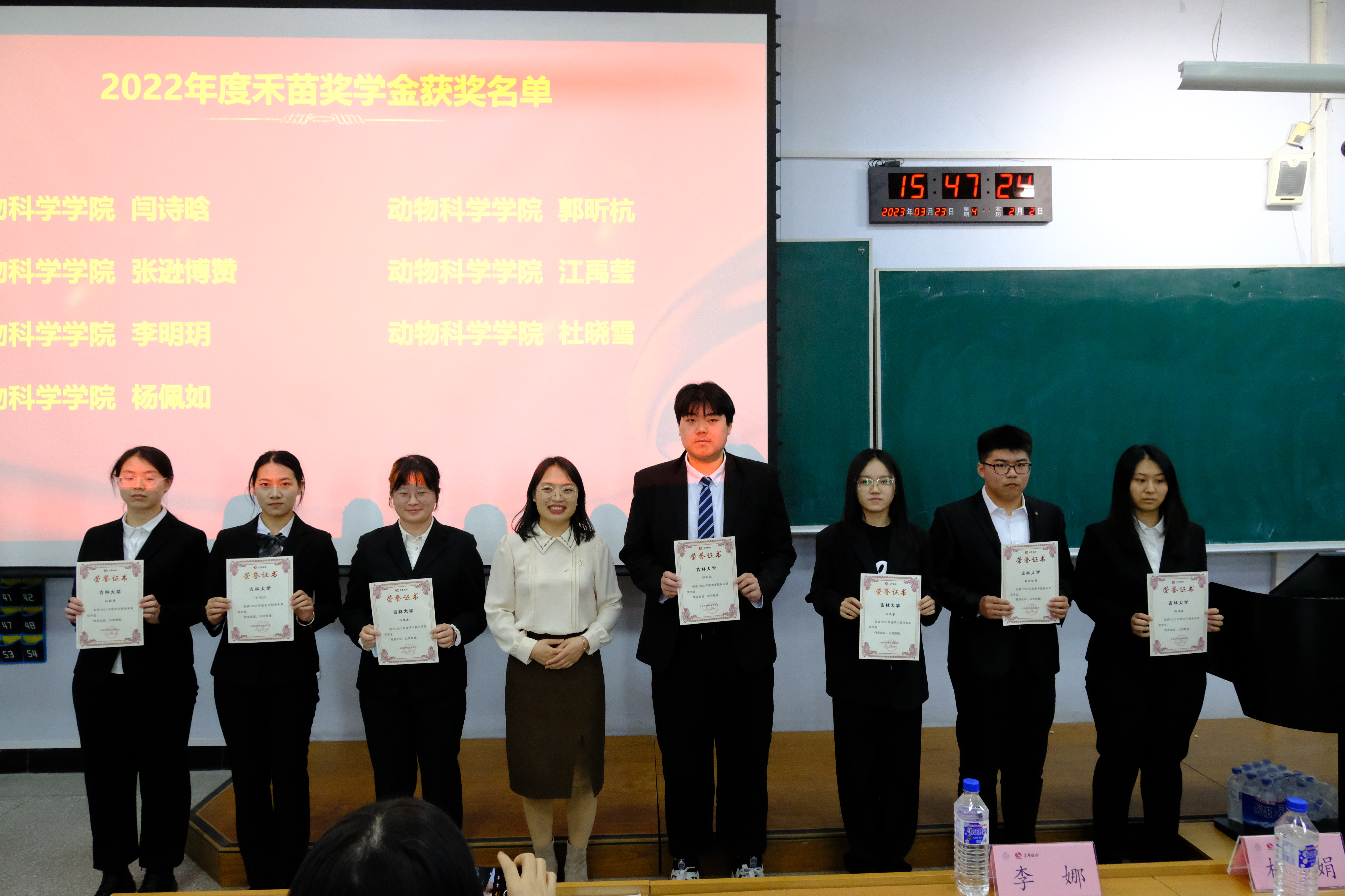 首先,肖建荣老师为本次活动致辞。肖老师对禾丰集团捐助“金卫东董事长助学金”“禾苗奖学金”,多年来心系高校师生,助力农科人才成长表示感谢,对禾丰集团蒸蒸日上来发展表示祝贺。随后,谭瑶老师宣读获奖名单,并向同学们表示祝贺。刁经理、王经理、杜经理依次为获奖同学颁奖并合影留念。 颁奖仪式结束后,杜经理为我们开展校园招聘宣讲,详细地向同学们介绍了禾丰牧业的集团文化、发展历史和未来规划等情况,重点介绍了集团的当前发展目标和人才培养计划。