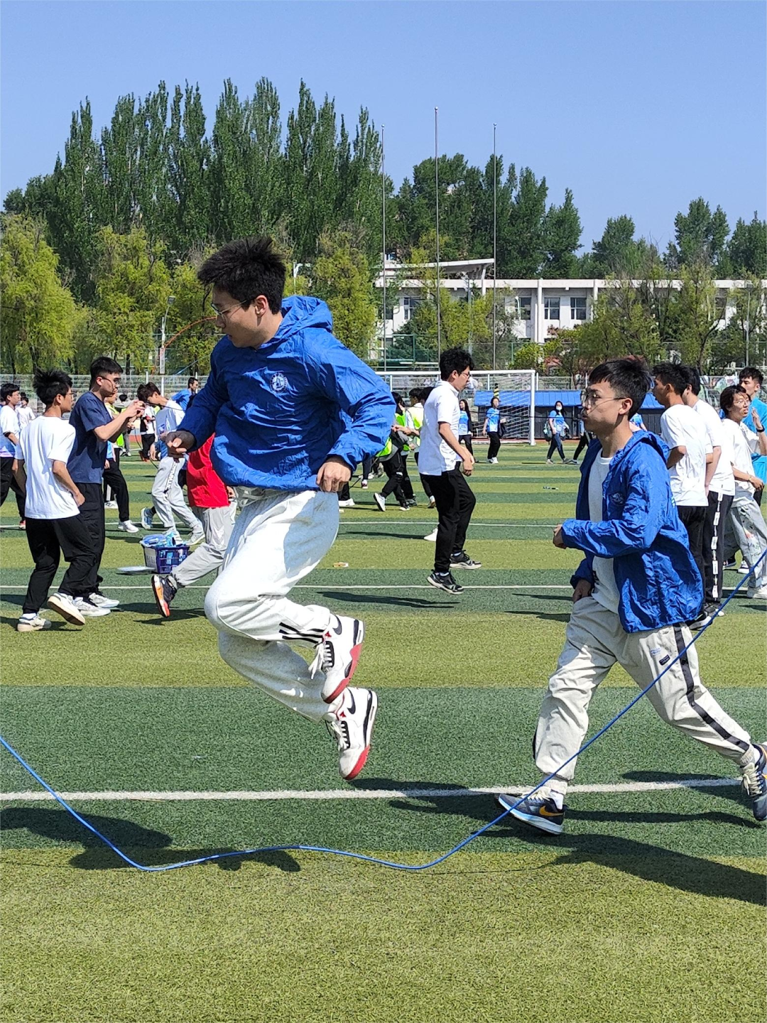 三分钟十人“8”字跳绳比赛在室外操场进行。随着裁判员的一声哨响,跳绳比赛运动员们个个轻如飞燕,绳子从他们的脚下一闪而过,场地上绳影闪闪,轻快如鸟雀般。我院男子十人八字跳绳取得第七名的好成绩,体现出每个人灵巧娴熟的跳绳能力,更能彰显出动科学子的团结与默契。