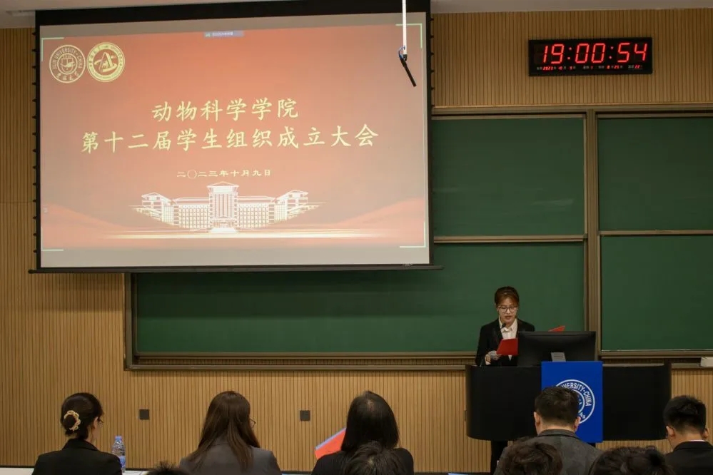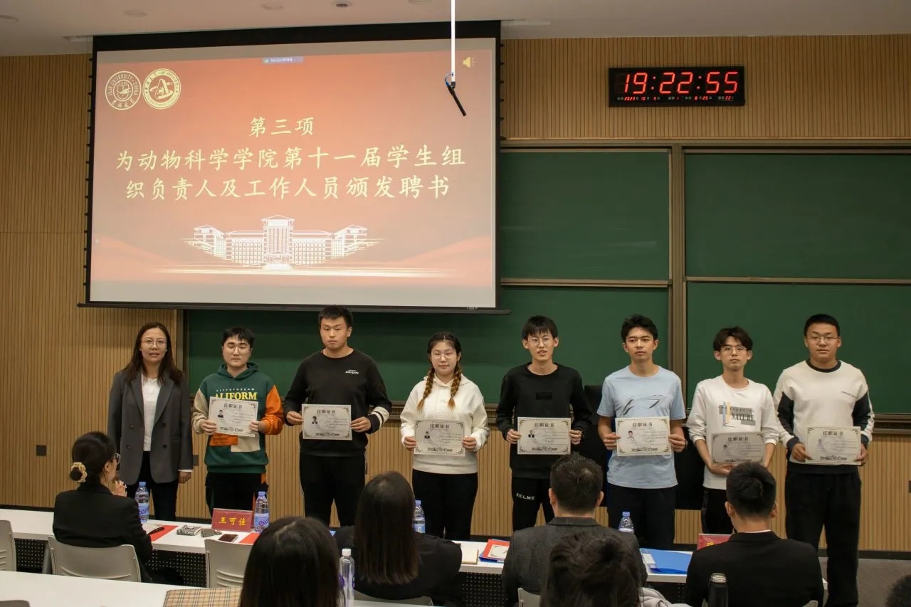 在庄严的国歌声中,大会正式开始。首先,第十一届学生会执行主席施政、强雪龙,团委副书记李欣欣,新媒体中心主任王梓权分别对学院过去一年所开展的工作进行了总结。肖建荣、王可佳分别为第十一届学生组织主要负责人、部门负责人及工作人员颁发了聘书。