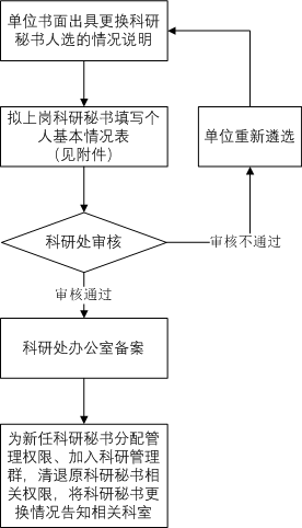 科研秘书承担单位的科研管理和服务工作,岗位人选一般应保持稳定,因特殊情况需要对岗位人选进行调整的,按如下流程办理。