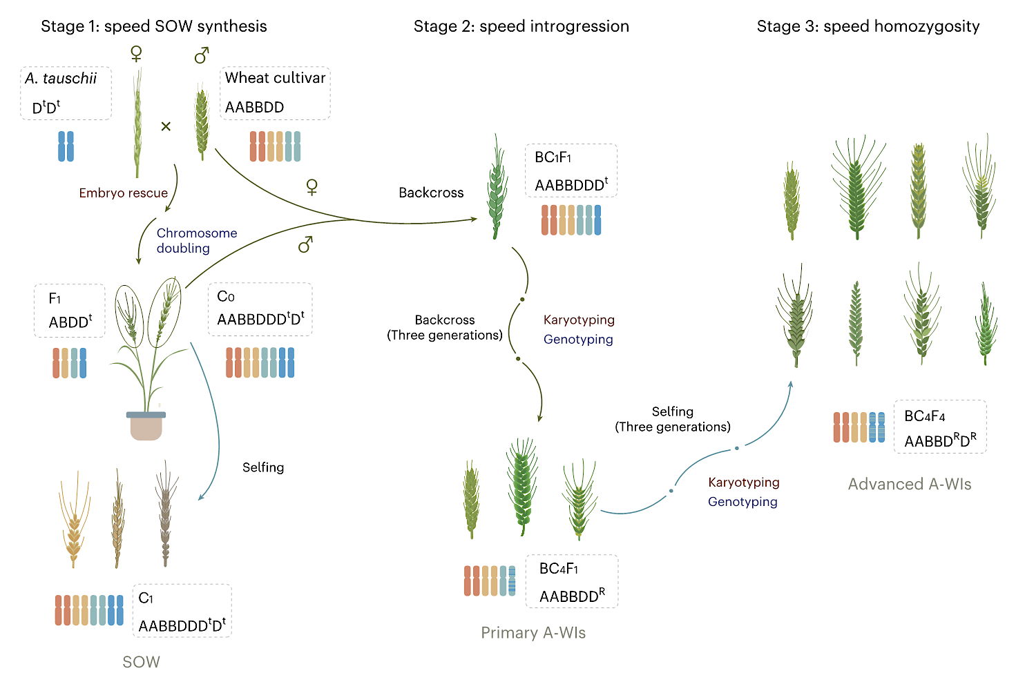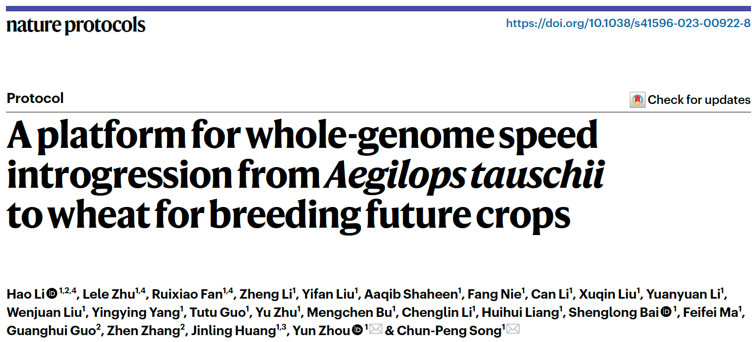 小麦是世界上最重要的粮食作物之一,为全球超过三分之一的人口提供能量来源。目前,随着全球气候的不断恶化,严重威胁了世界农业生产。自工业革命以来,作物育种目标发生了很大变化,上世纪60年代的绿色革命,开发了能够应对肥料和灌溉而不倒伏的半矮化小麦品种,由于长期多倍化和育种驯化历程,使得六倍体面包小麦遗传多样性日益狭窄,成为当前小麦育种的最大“瓶颈”。针对如何提高小麦产量和品质,培育出抗逆性高且快速适应气候变化的现代小麦新品种这些重大科学和生产问题,宋纯鹏教授团队探索从小麦D亚基因组的野生近缘种引入优异基因资源的新策略,成功创建节节麦-小麦渐渗(A-Wi)平台和技术体系,这一庞大的小麦D基因组改良工程不仅赋予小麦抗性、品质和产量等新的农艺性状,也为整个禾谷类作物改良提供了可供借鉴的经典技术范例。其关于节节麦全基因组快速渐渗的研究成果于2023年11月28日以“A platform for whole-genome speed introgression fromAegilops tauschiito wheat for breeding future crops”为题发表在Nature Protocols杂志上。