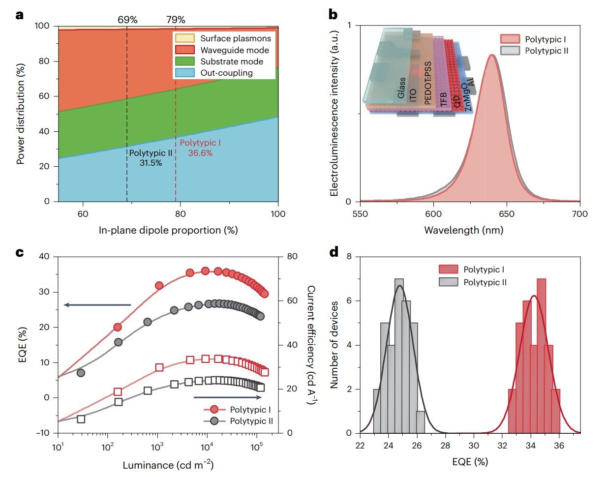针对上述问题,申怀彬教授与中国科学技术大学樊逢佳教授、杜江峰院士等人合作,利用混合相CdZnSeS量子点中的偶极-偶极相互作用使量子点有效排列,有效增强了发光二极管中的光子外耦合效率。本研究开发出一种新型的多型晶体结构的量子点,使用纤锌矿CdZnSe核作为结构模板来外延生长纤锌矿ZnS壳层,得到了纤锌矿与闪锌矿ZnS共存的多型晶体结构量子点(图1)。强离子性的纤锌矿ZnS提供了排列量子点所需的大电偶极矩;闪锌矿ZnS部分影响电子结构,从而促进每个量子点的取向发光,两方面结合实现了跃迁偶极矩取向的调控。背焦面成像等手段确认了此量子点材料的跃迁偶极矩取向,具有79%的面内偶极矩占比(图2);使用该量子点制备的QD-LED表现出超高的效率和稳定性(外量子效率35.6%,1000 cd m-2亮度下T95寿命:40,900小时)(图3)。
