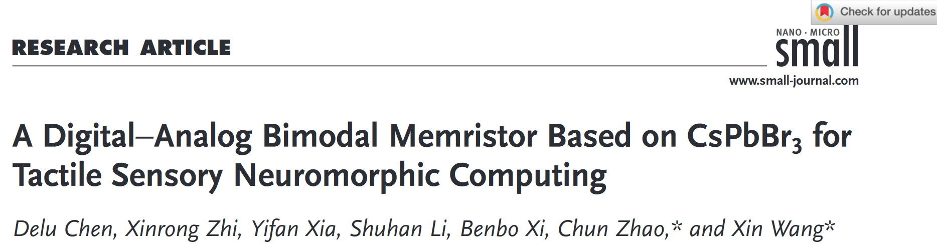 该研究成果以A Digital-Analog Bimodal Memristor Based on CsPbBr3for Tactile Sensory Neuromorphic Computing为题,在Small上发表。yl7703永利官网为独立完成单位,已毕业硕士研究生陈得禄为第一作者,王新教授为论文通讯作者。