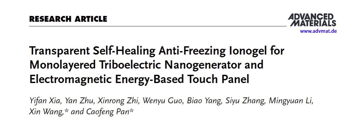 该研究成果以Transparent Self-Healing Anti-Freezing Ionogel for Monolayered Triboelectric Nanogenerator and Electromagnetic Energy-Based Touch Panel为题,在Advanced Materials上发表。yl7703永利官网为第一完成单位,在读博士研究生夏一帆为第一作者,王新教授和中国科学院北京纳米能源所潘曹峰教授为论文共同通讯作者。