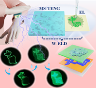 目前,防伪和视觉光学信息加/解密技术在信息安全领域受到了广泛关注,但发光加密技术仍然面临着外部高压电源、复杂的结构和昂贵的解密设备等巨大挑战,阻碍了其广泛应用。王新团队开发了一种可穿戴式集成自供电电致发光(EL)显示器件(W-ELD),该器件由MXene/硅基摩擦电纳米发电机(MS-TENG)和基于共享MXene电极的EL器件组成,用于图案显示和信息加密。当滴下导电电解质溶液时,图案化MXene电极的W-ELD可以通过自驱动的电致发光器件显示精确的加密信息,实现实时的可视化信息交互。集成MS-TENG和EL器件的一体化MXene电极W-ELD展示了卓越的图案信息加密功能,在可穿戴自供电光电器件、柔性显示器和加密技术方面具有潜在的应用前景。