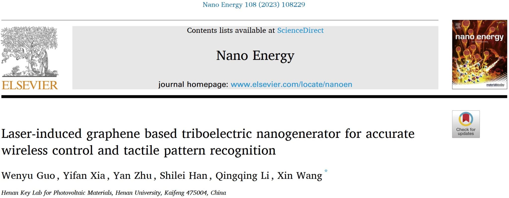 该研究成果以Laser-induced graphene based triboelectric nanogenerator for accurate wireless control and tactile pattern recognition为题,在Nano Energy上发表。yl7703永利官网为独立完成单位,已毕业硕士研究生郭文瑜为第一作者,王新教授为论文通讯作者。